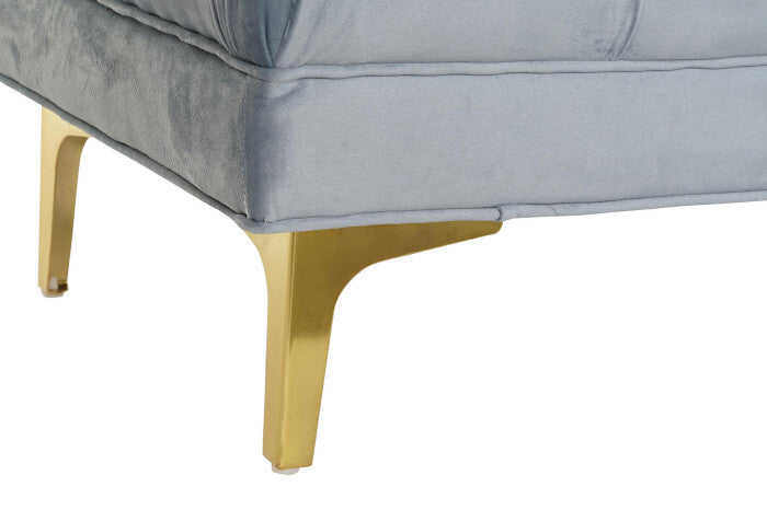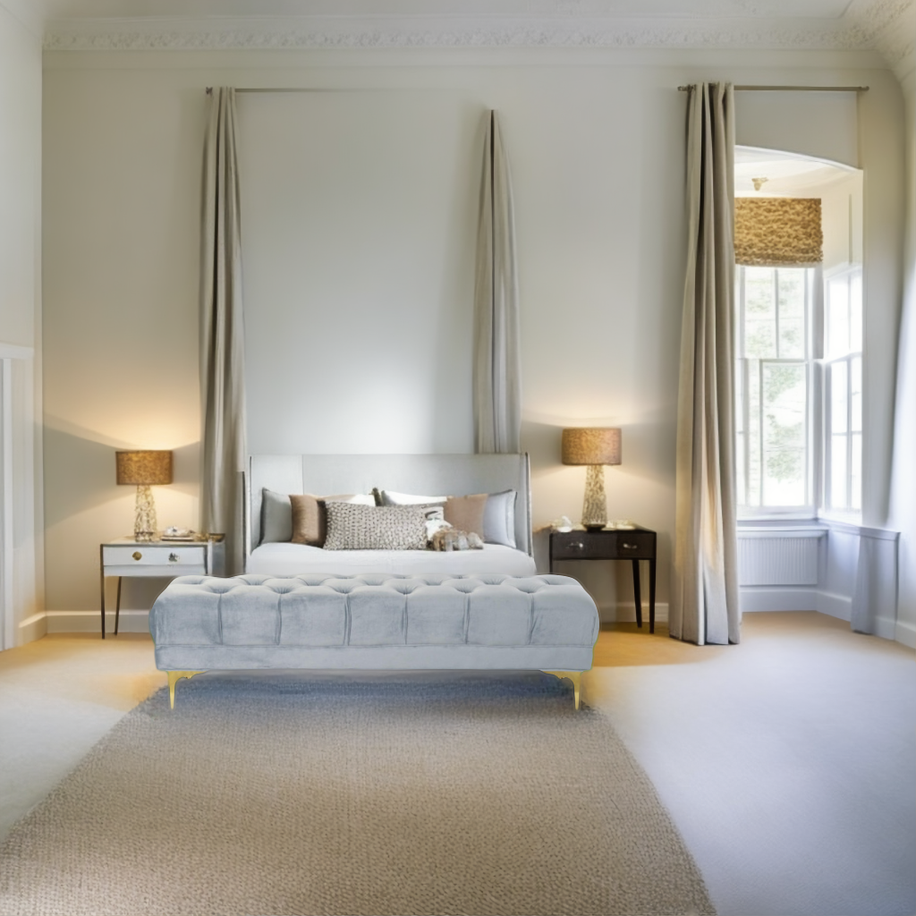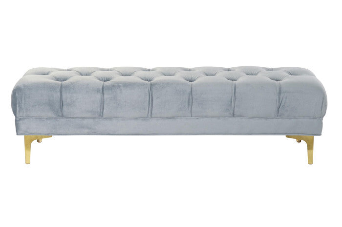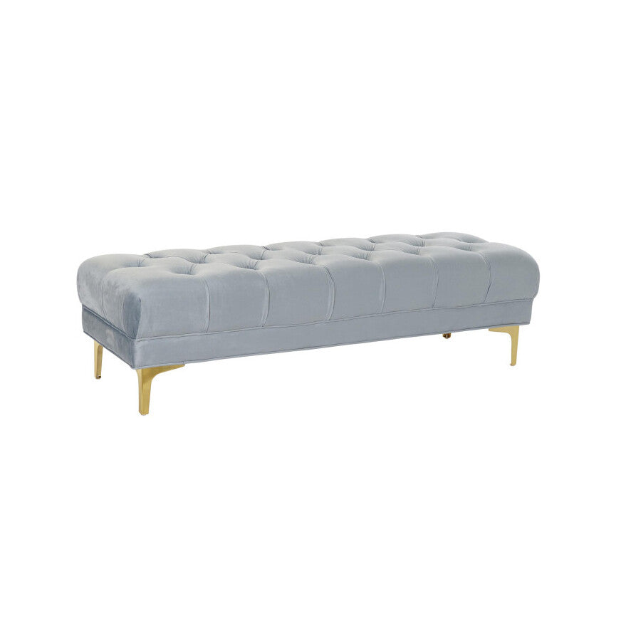 Banco Capitoné Azul e Dourado 140cm. Banco Capitoné é um banco que não só permite sentar-se aos pés da cama, ajudá-lo no vestuário ou completar a decoração da sua casa. Um design que combina um tecido veludo azul com pernas douradas para criar uma peça de mobiliário elegante e sofisticada. Graças ao seu design simples e intemporal nunca sairá de moda e será fácil de combinar com qualquer estilo decorativo.