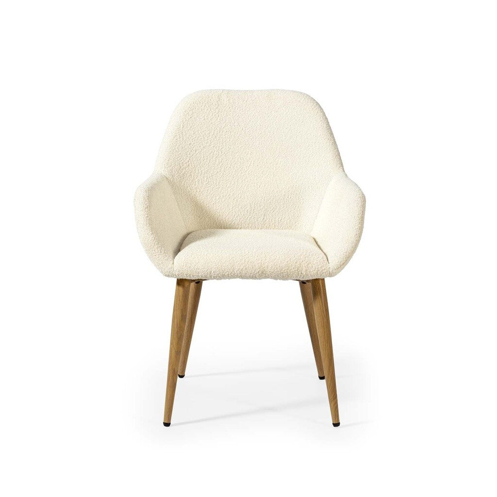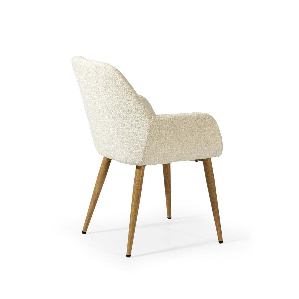 Cadeira Bouclé branco, com pernas em madeira. Para além de ser um assento confortável e cómodo, a nossa cadeira elegante e sofisticada de última tendência. Ideal para salas de estar, salas de jantar e cozinhas, é também o acessório decorativo perfeito para completar a decoração dos quartos ou vestuários. Contemporâneo em estilo, combina um assento, encosto estofado num tecido macio que é agradável tanto à vista como ao tacto, com pernas de metal.