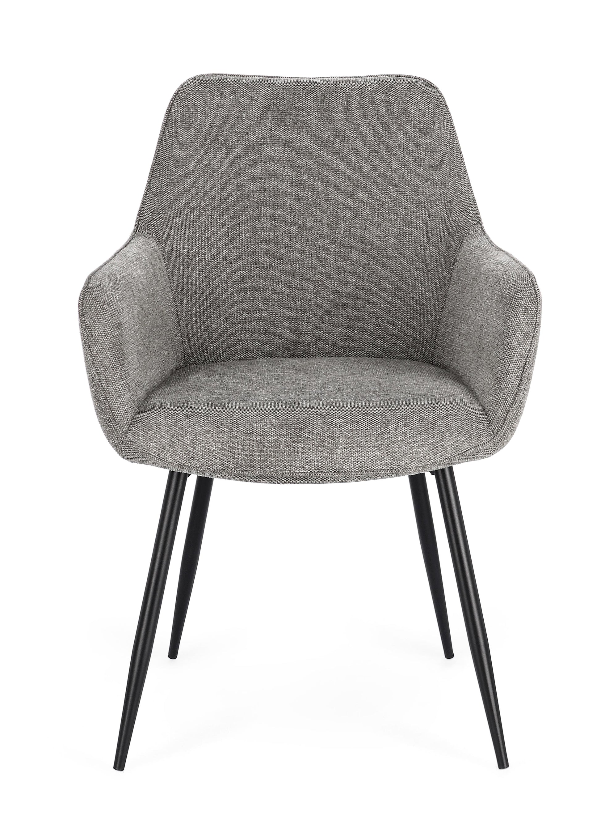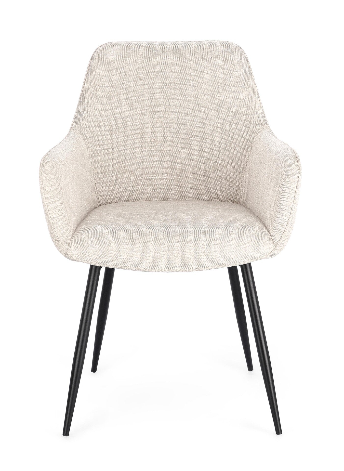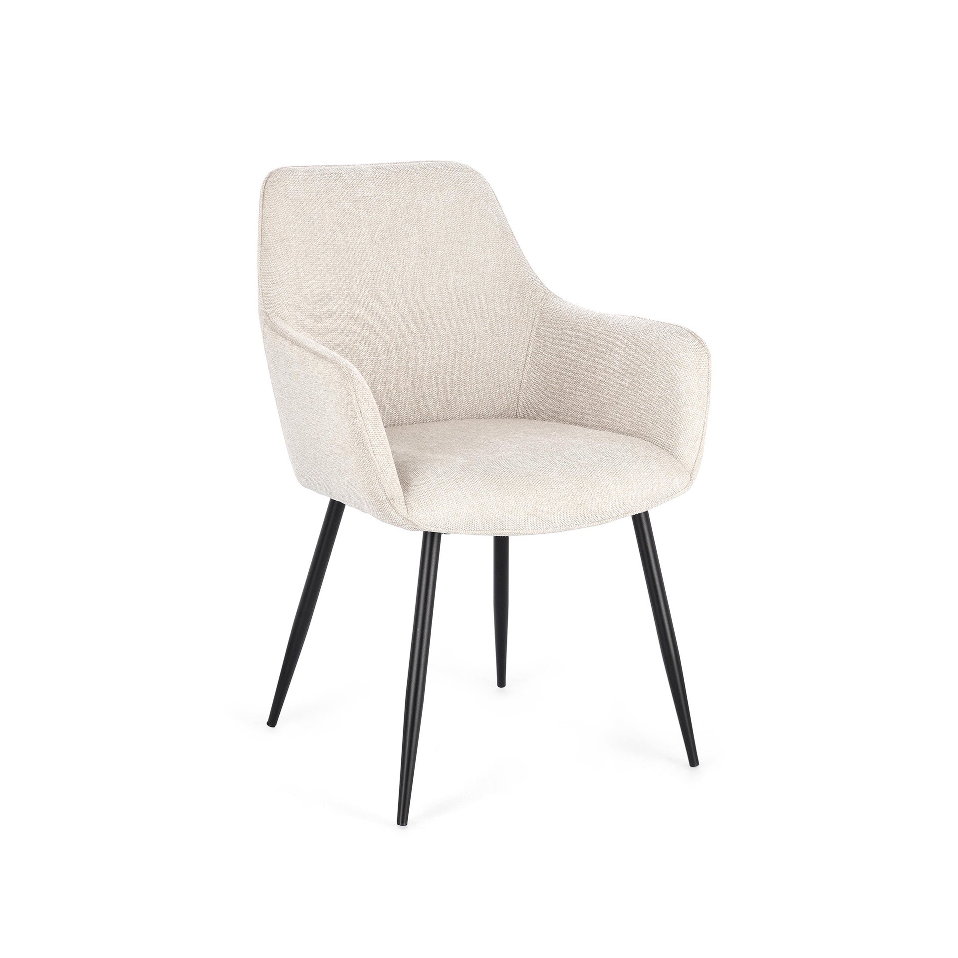 Cadeira Cora com braços bege, com pernas em metal preto. Para além de ser um assento confortável e cómodo, a nossa Cadeira Cora é uma cadeira elegante e sofisticada de última tendência. Ideal para salas de estar, salas de jantar e cozinhas, é também o acessório decorativo perfeito para completar a decoração dos quartos ou vestuários. Contemporâneo em estilo, combina um assento, encosto estofado num tecido macio que é agradável tanto à vista como ao tacto, com pernas de metal.