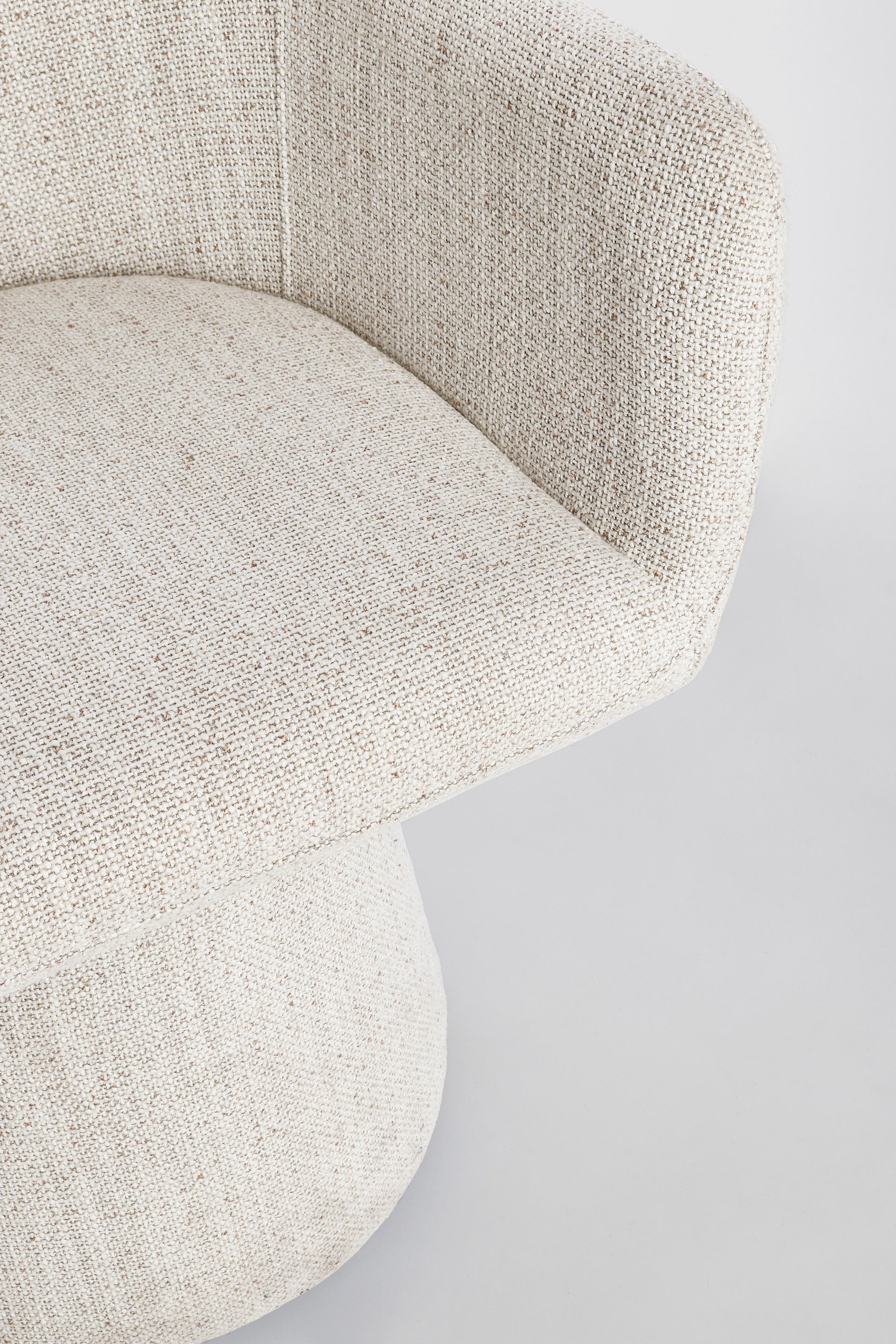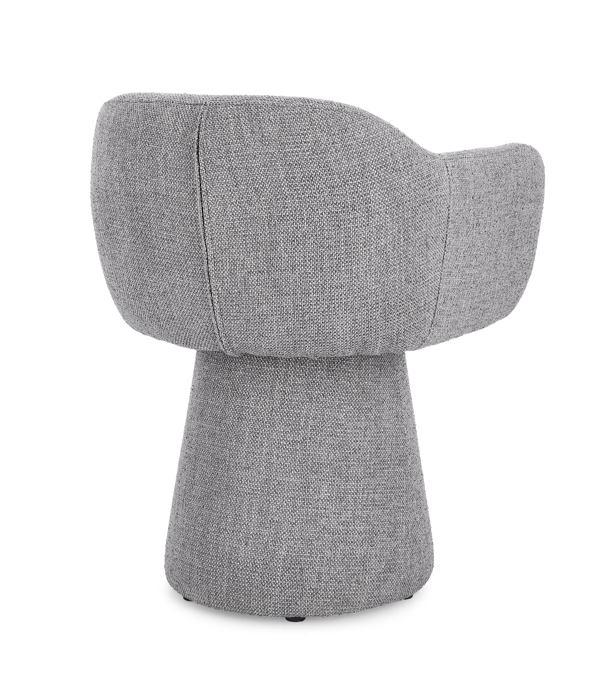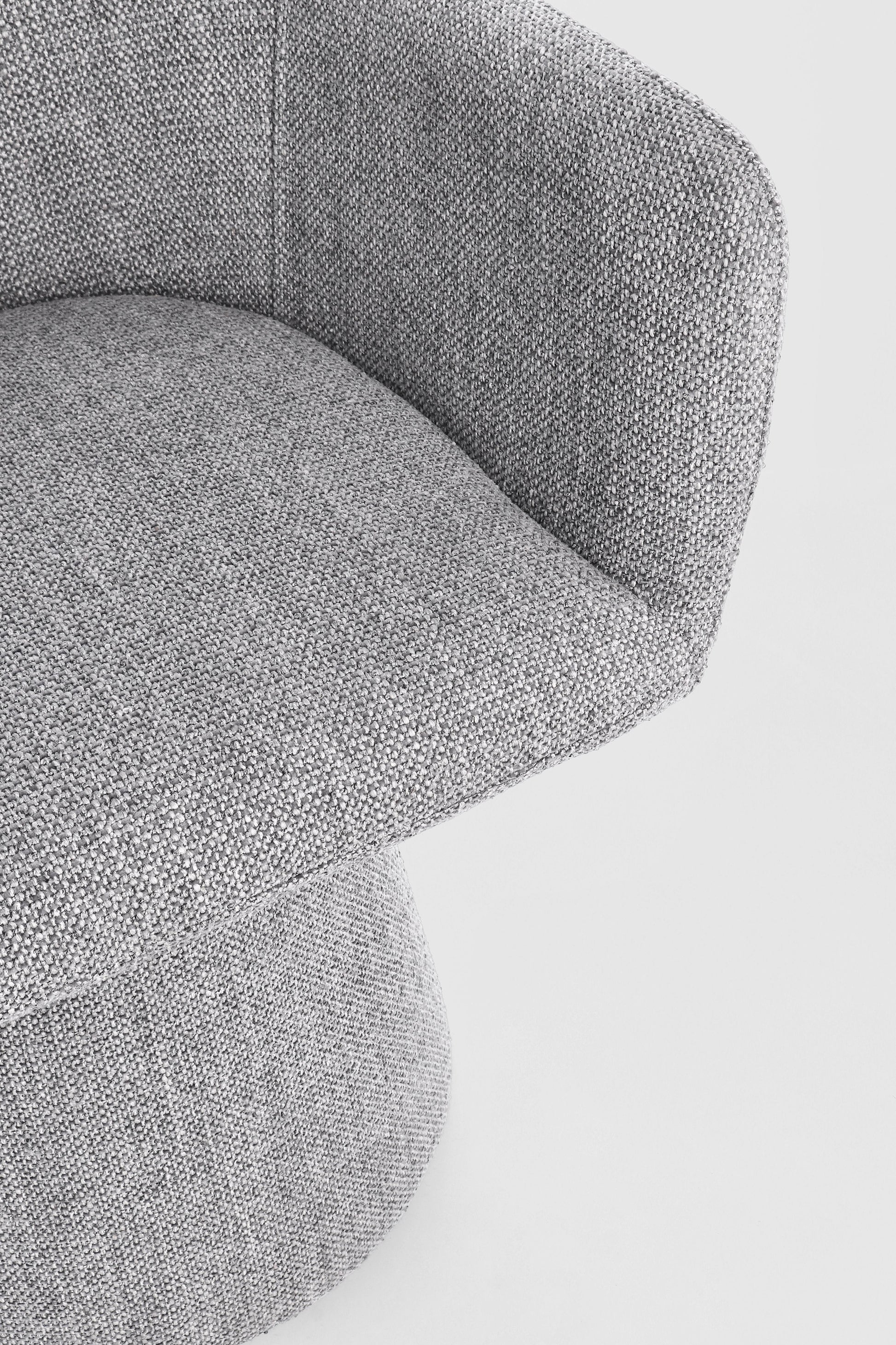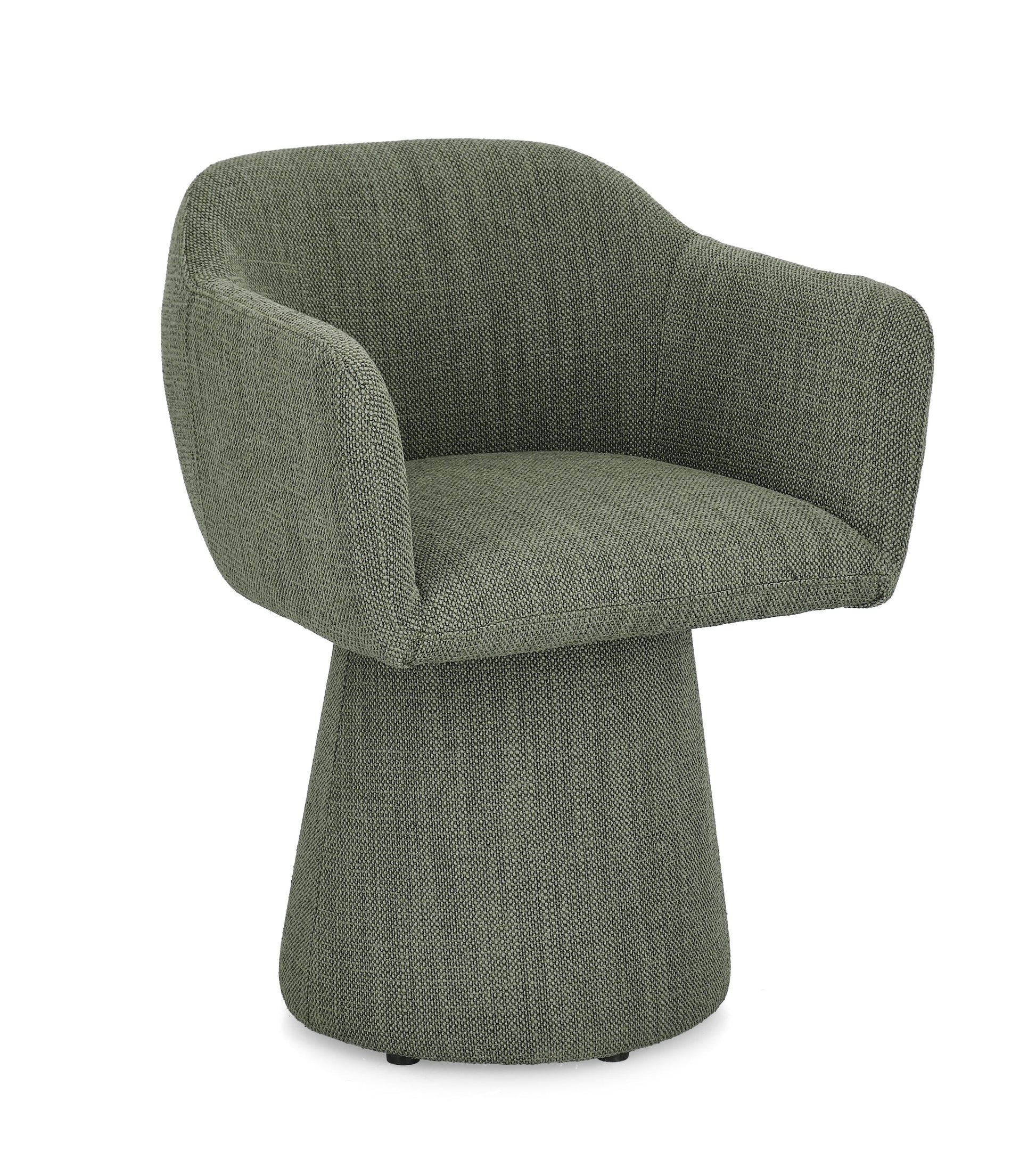 Pés baixos na madeira compensada, parte traseira no aço. Assento giratório 180° com mecanismo de retorno, em aço revestido a pó e contraplacado. Assento 22 kg/m3 encosto 30 kg/m3. Revestimento 97% poliéster 3% acrílico.