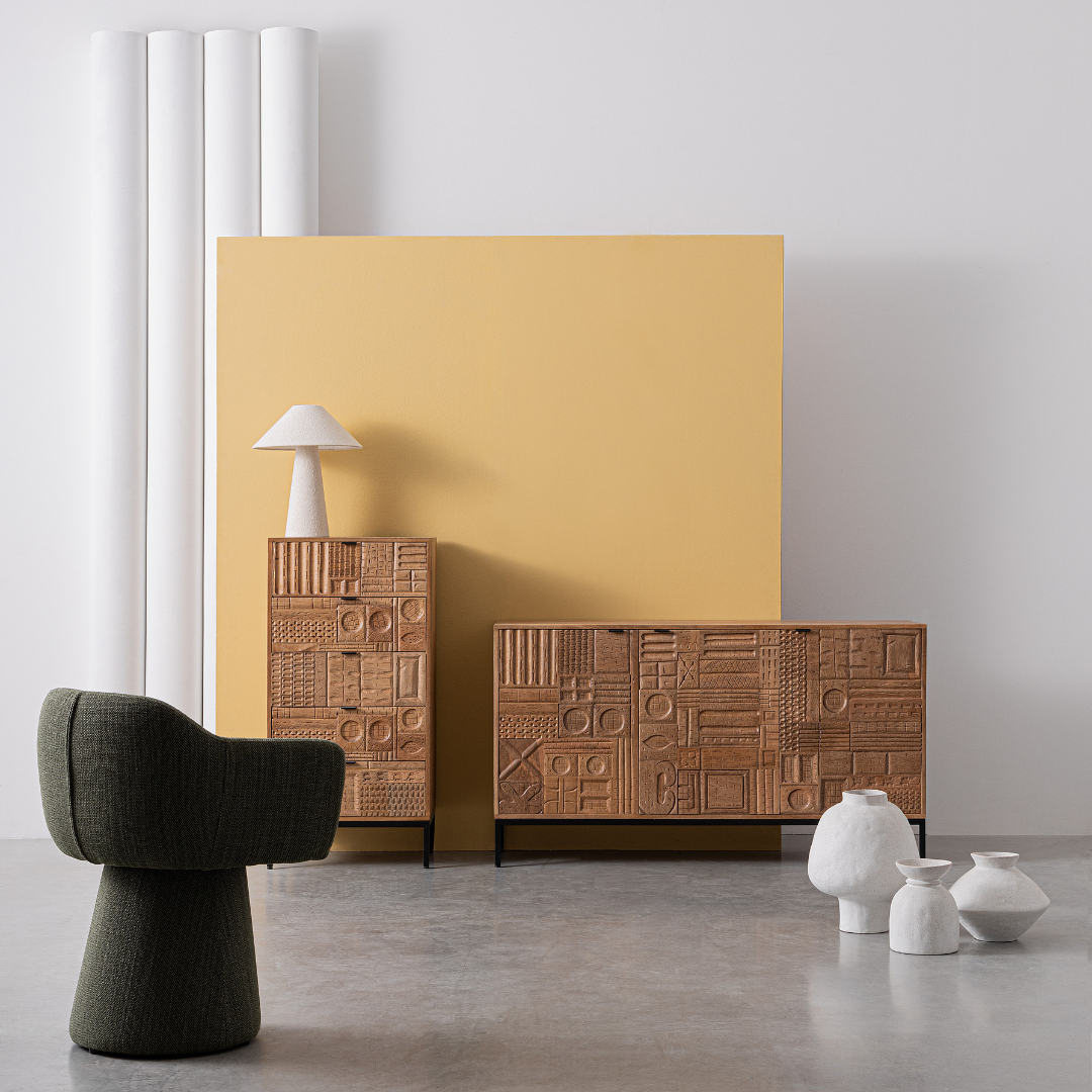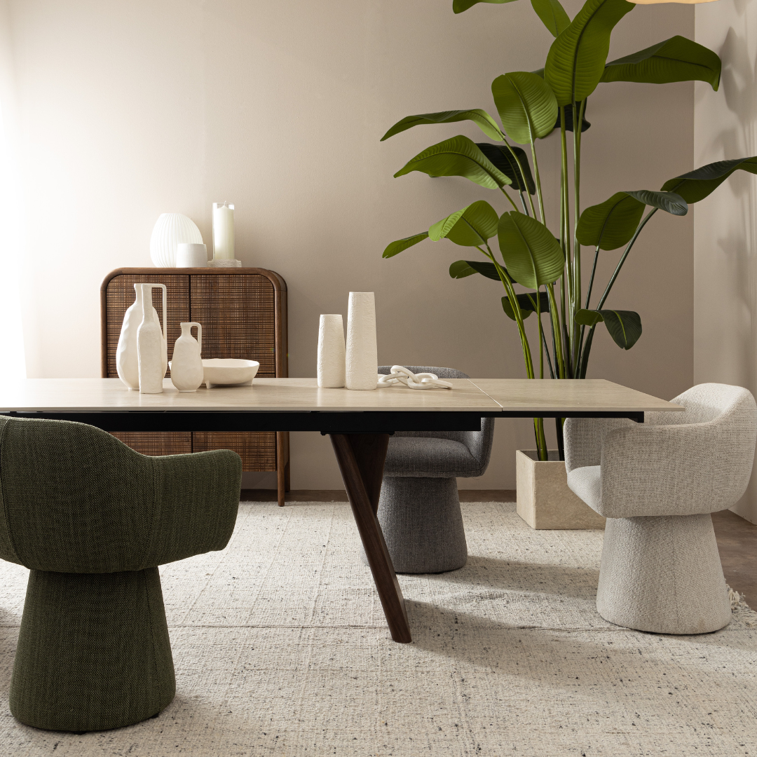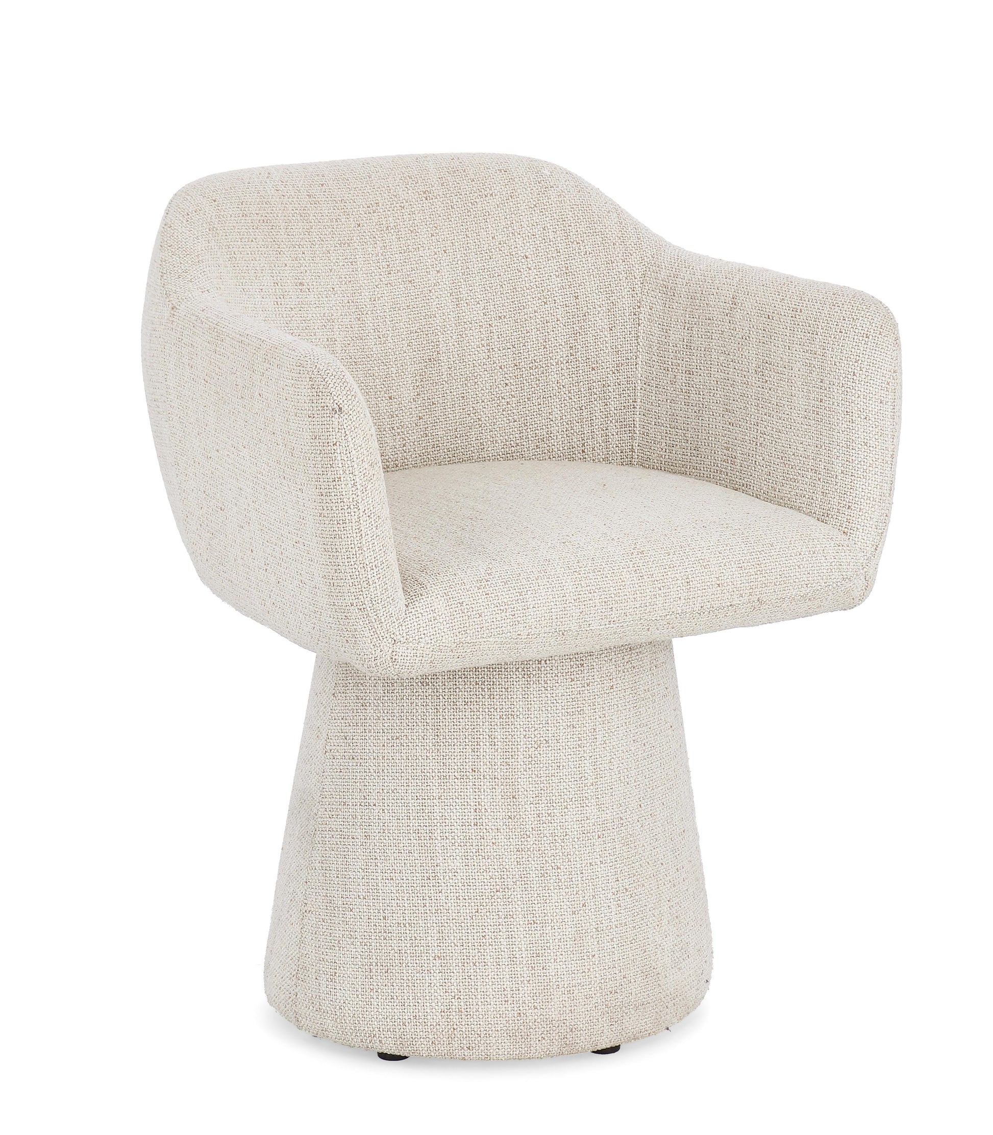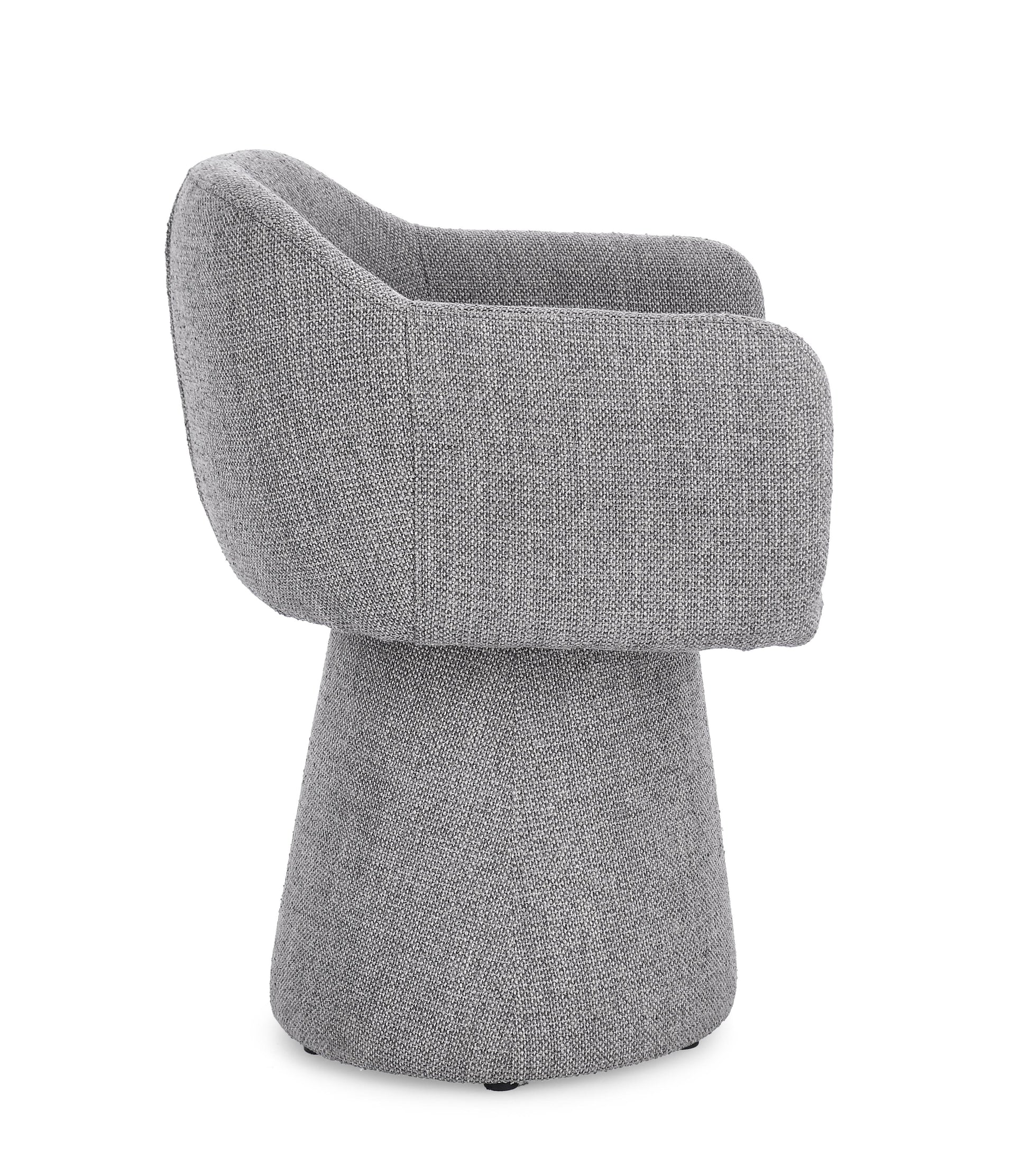 Pés baixos na madeira compensada, parte traseira no aço. Assento giratório 180° com mecanismo de retorno, em aço revestido a pó e contraplacado. Assento 22 kg/m3 encosto 30 kg/m3. Revestimento 97% poliéster 3% acrílico.
