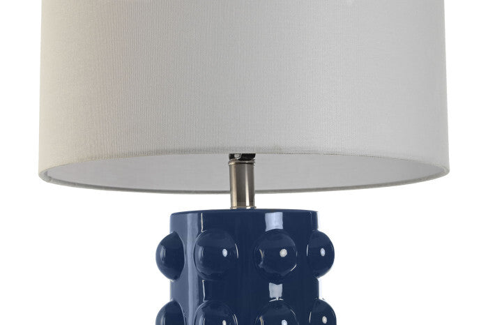 Candeeiro de mesa Azul Escuro c/Abajur Branco, com pé em cerâmica vidrada e mateis prateados e abajur tecido branco. Coloque-o onde preferir, no móvel do hall de entrada, no aparador da sala ou na mesa de cabeceira. Só depende de si!