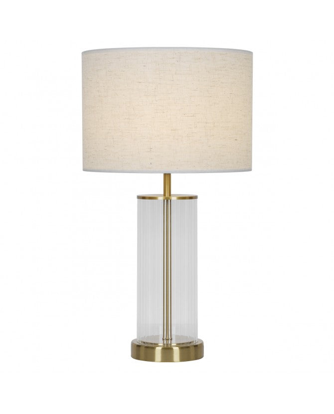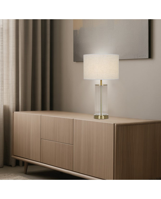 O candeeiro de mesa Calabria destaca-se pela sua elegância intemporal e pelo equilíbrio perfeito entre materiais nobres e design sofisticado. Com estrutura em metal com acabamento em latão, base em vidro transparente e abajur em tecido tipo linho, é uma peça decorativa que acrescenta charme e requinte a qualquer espaço.