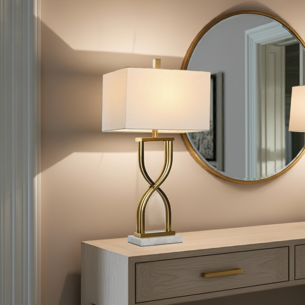 Candeeiro Mesa Infinity, com base de mármore e estrutura dourada e abajur branco incluído. Para criar ambientes suaves e acolhedores na sua sala de estar, quarto ou entrada. Ideal para decorar em estilo sofisticado moderno.
