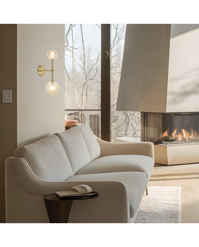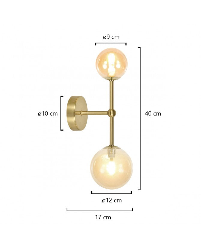 O aplique de parede Galáxia de 2 luzes combina elegância e design contemporâneo, destacando-se pelo seu acabamento em latão e pelas tulipas em vidro âmbar. A composição com duas esferas de diferentes dimensões cria um efeito visual dinâmico e sofisticado, ideal para valorizar paredes em salas de estar, corredores ou quartos. Compatível com lâmpadas G9, proporciona uma iluminação acolhedora e decorativa, perfeita para criar ambientes envolventes.