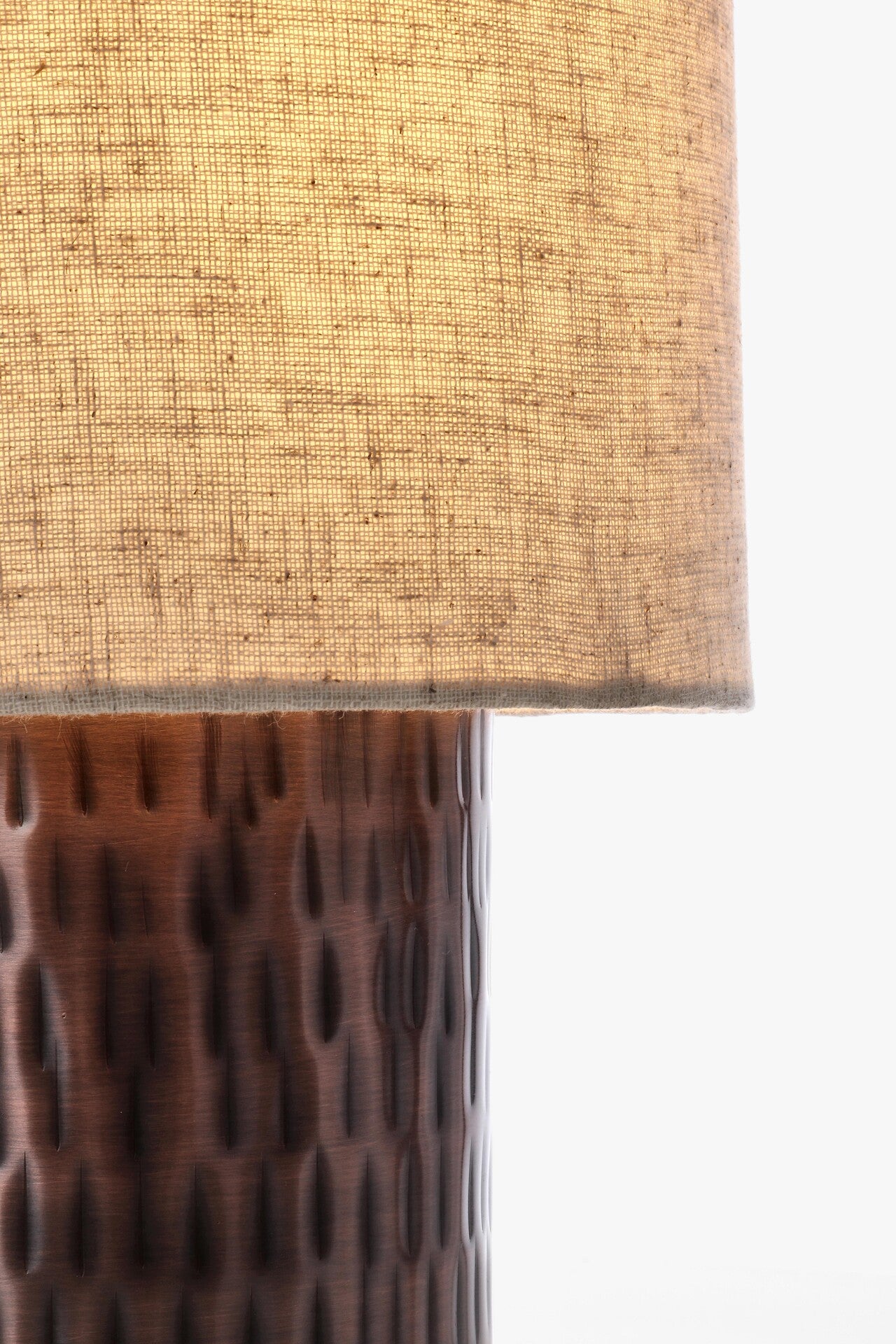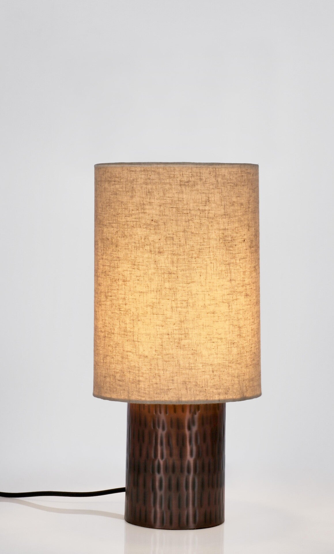 Candeeiro de mesa, com pé em metal castanho, e combinando com abajur em algodão bege.