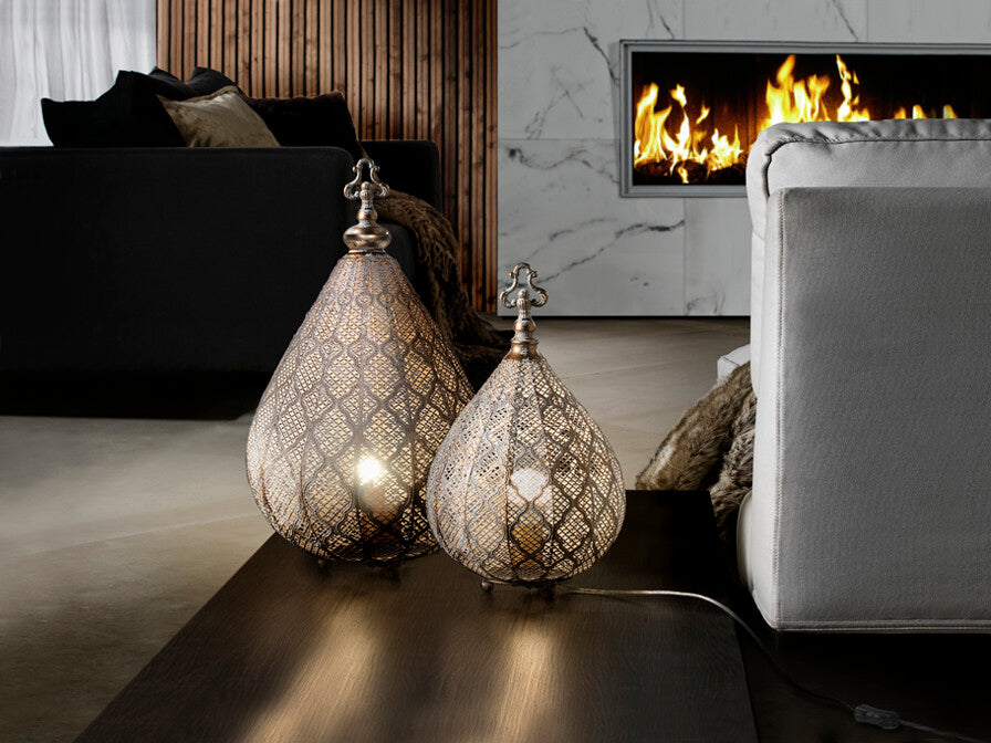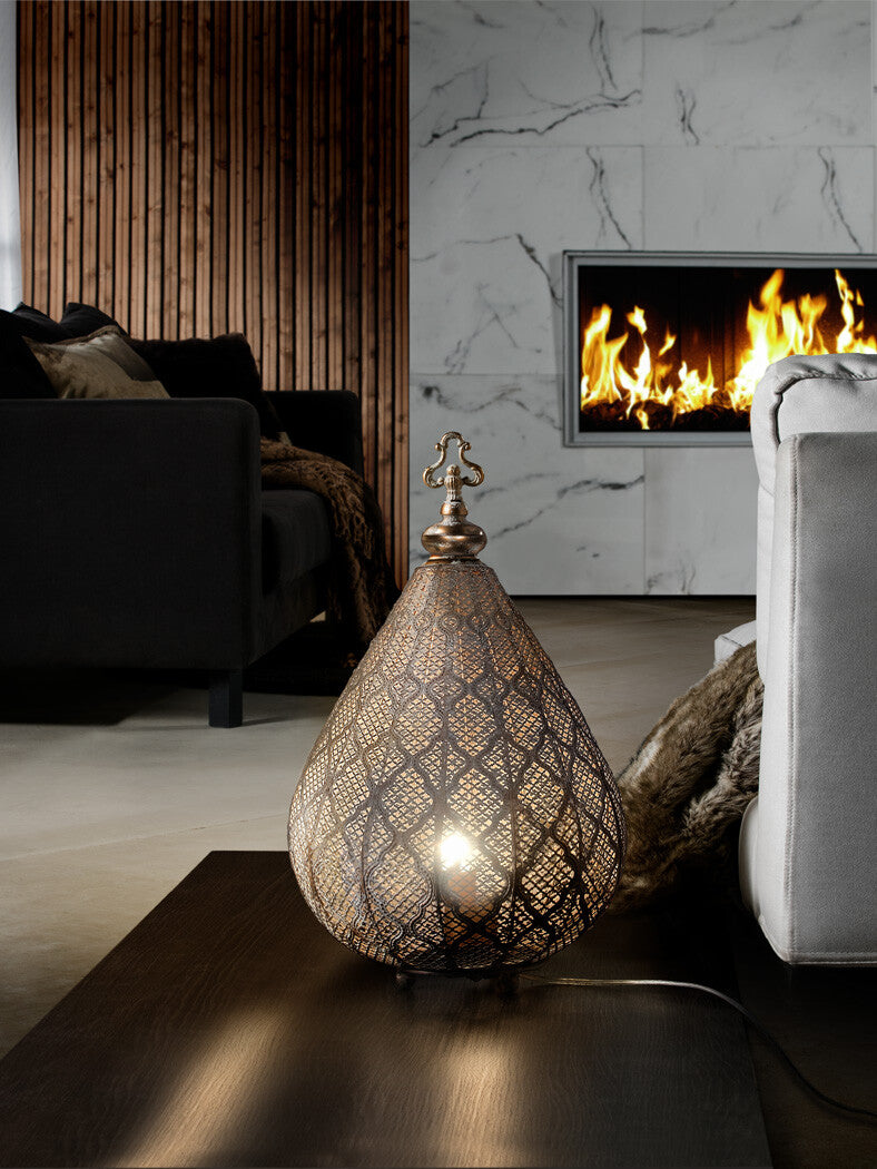 O candeeiro de chão ou mesa Schuller NABILA tem um ar marroquino. Fica bem em qualquer decoração moderna ou rústica. Realizado em metal. Tem acabamento champanhe com detalhes dourados e patina branca. O candeeiro de chão e mesa Schuller NABILA farol cria um belo efeito de iluminação. Pode regular a intensidade da luz tornando o ambiente mais aconchegante.