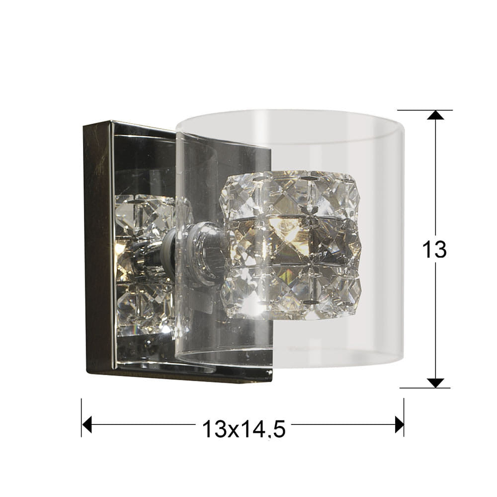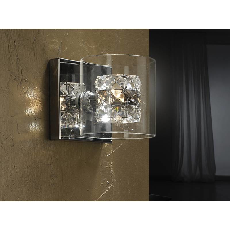 Aplique, de 1 lâmpada, realizado em metal acabamento cromado. Dupla tulipa no exterior de vidro moldado e no interior de copens facetados de vidro transparente e smoke.
