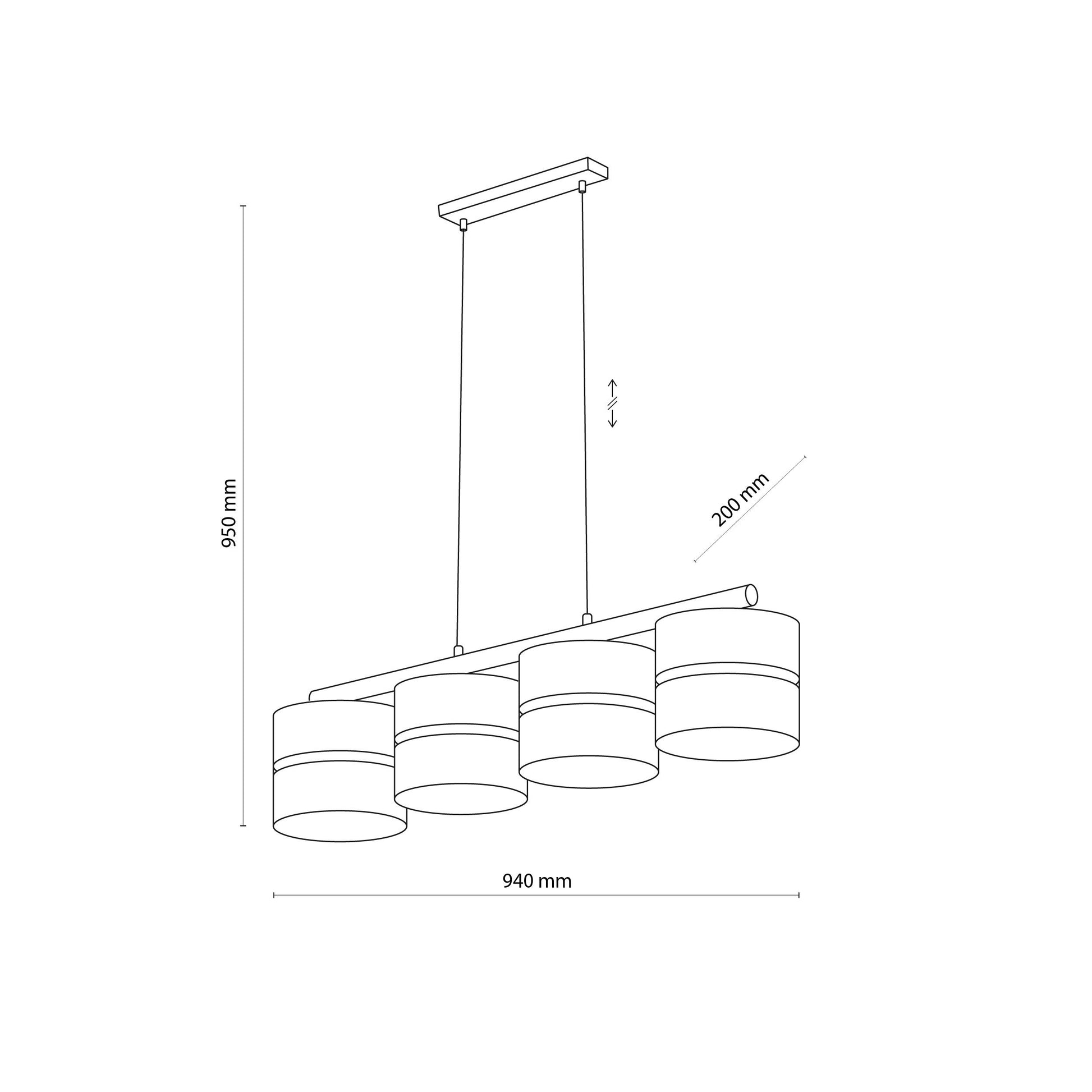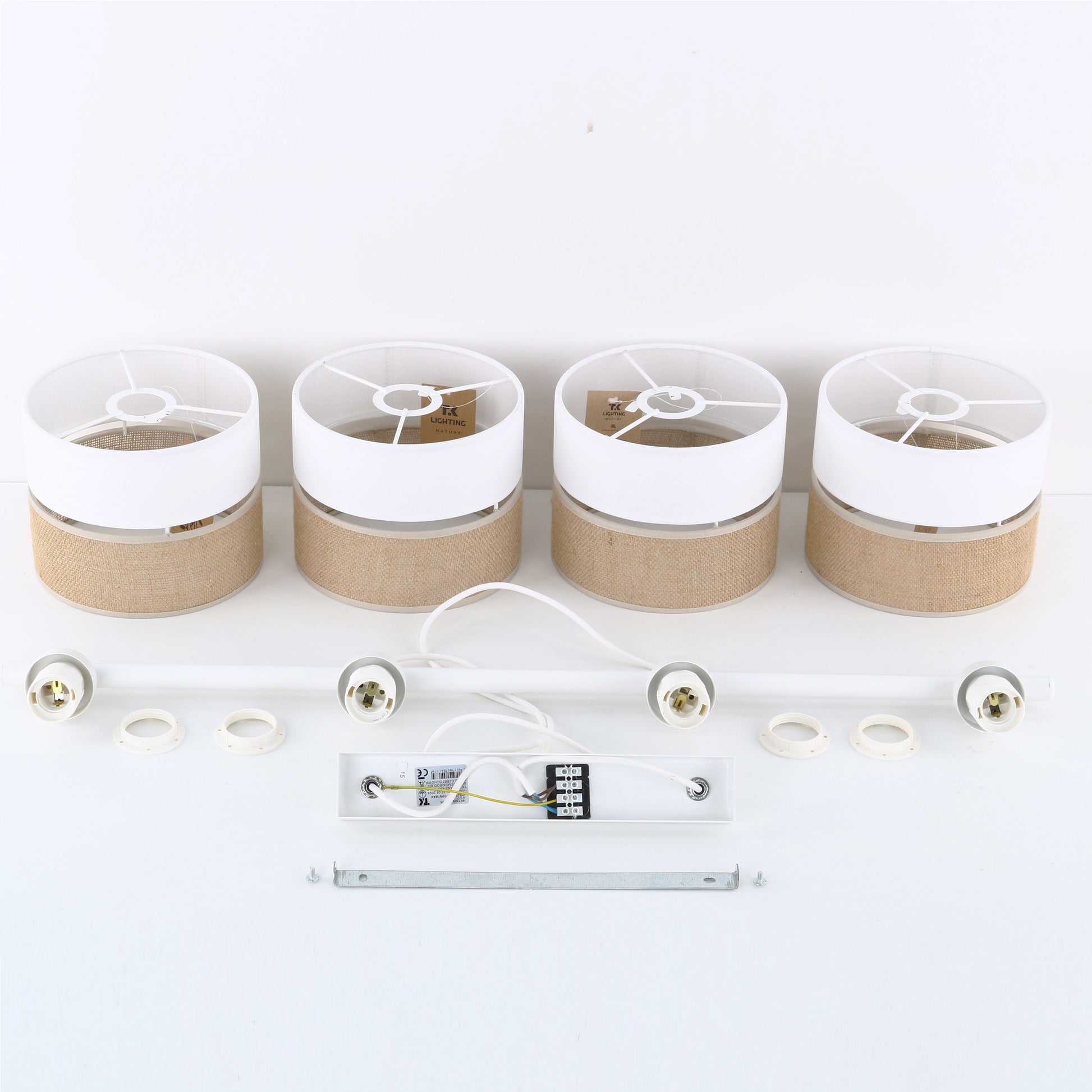 Candeeiro teto LinoBianco 4L pendente com uma base fina retangular de metal branco com onde estão quatro cabos para abajures de tecido e juta. De tecido cor branca na parte de cima e na parte inferior de juta. Candeeiro moderno adequado para iluminar a sua sala de estar, sala de jantar, hotel e restaurante.