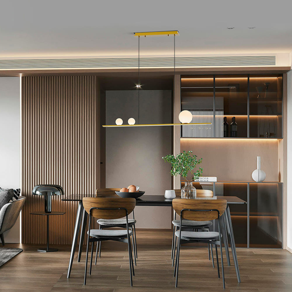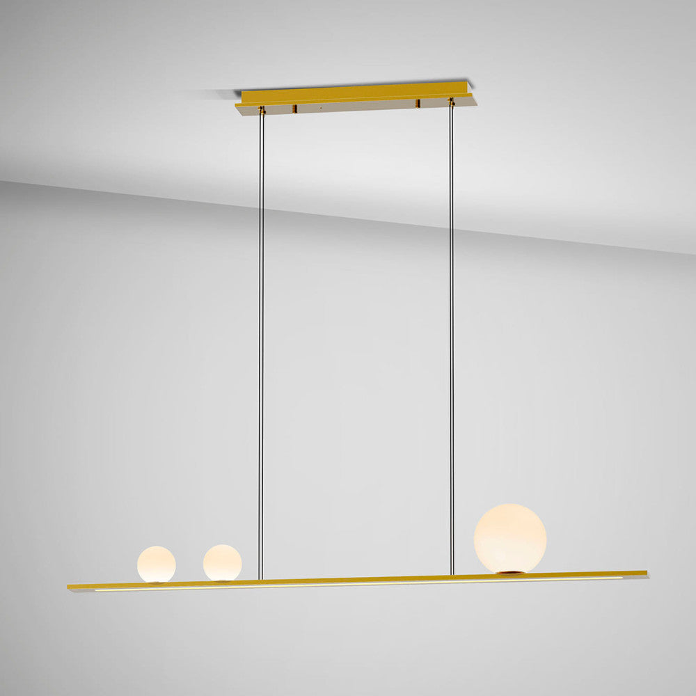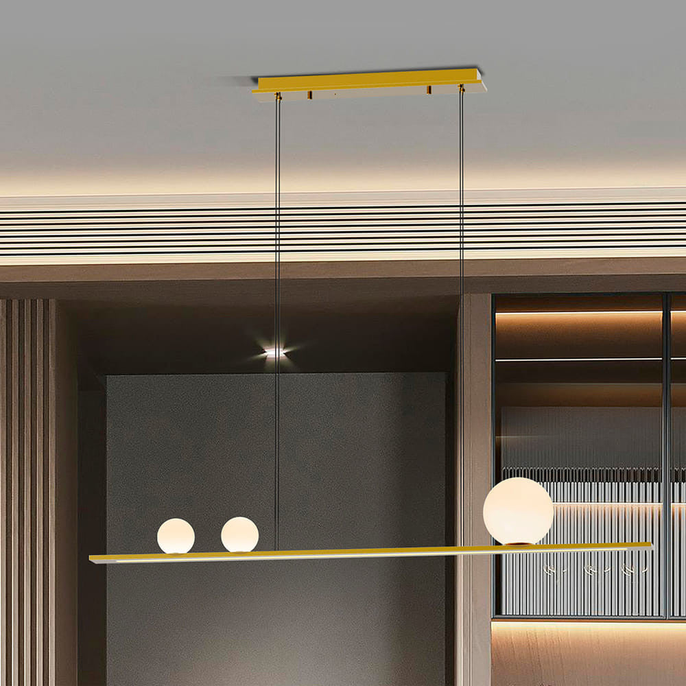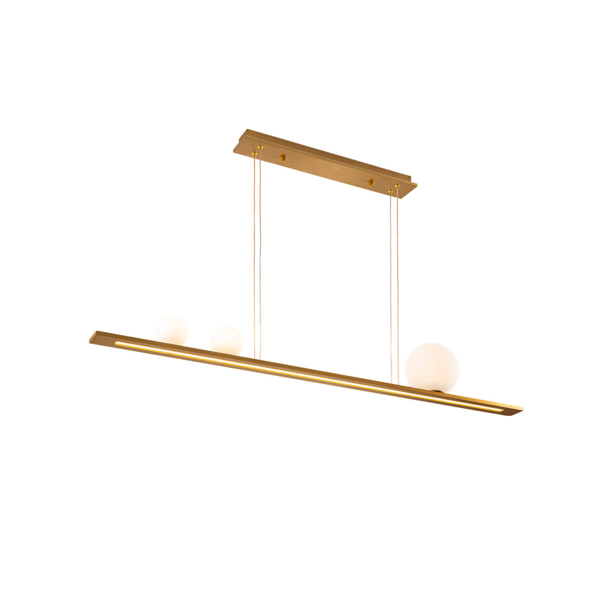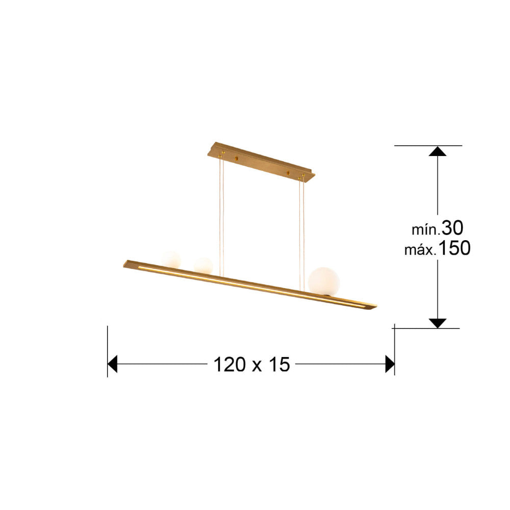 O candeeiro suspenso Mila da marca Schuller combina elegância e funcionalidade, sendo perfeito para salas de estar, salas de jantar ou quartos modernos. Realizado em alumínio escovado com acabamento dourado, apresenta 3 tulipas esféricas em vidro branco mate e difusor inferior em acrílico opalino, garantindo uma iluminação uniforme e acolhedora.