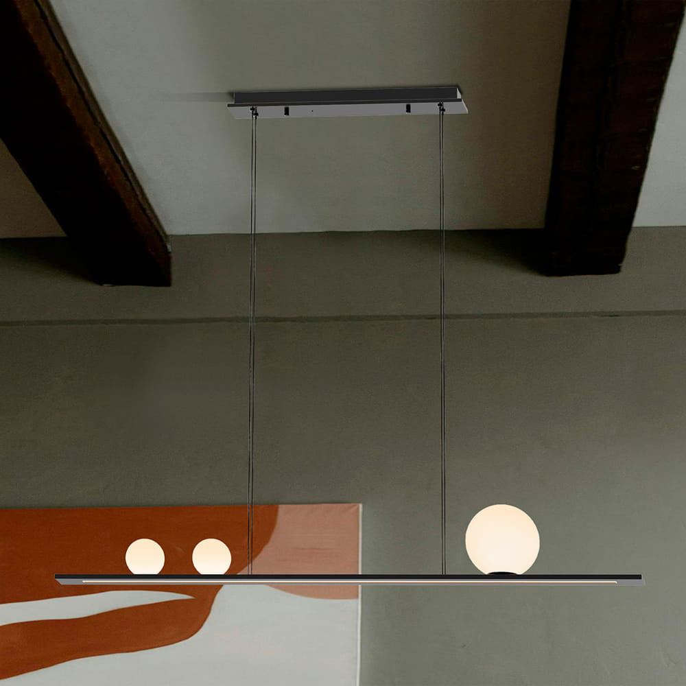 O candeeiro suspenso Mila da marca Schuller combina elegância e funcionalidade, sendo perfeito para salas de estar, salas de jantar ou quartos modernos. Realizado em alumínio preto, apresenta 3 tulipas esféricas em vidro branco mate e difusor inferior em acrílico opalino, garantindo uma iluminação uniforme e acolhedora.