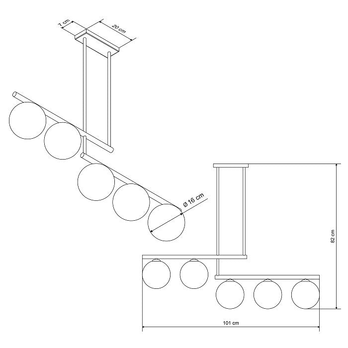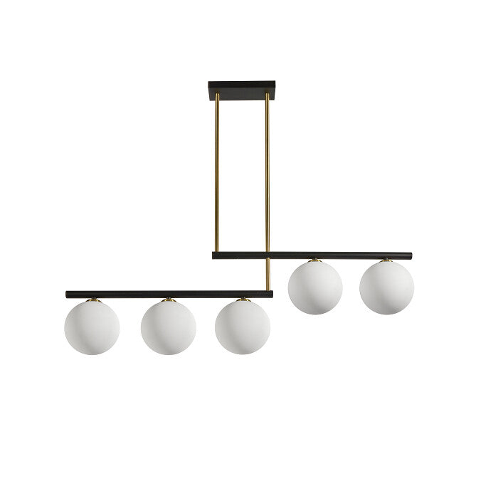 Corpo preto, com tubos dourados vindos do teto e cinco esferas de vidro opacas adicionam um estilo moderno extraordinário ao interior.