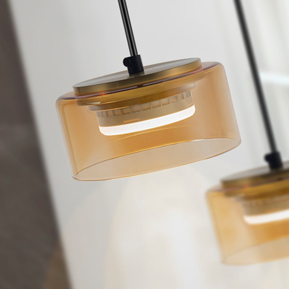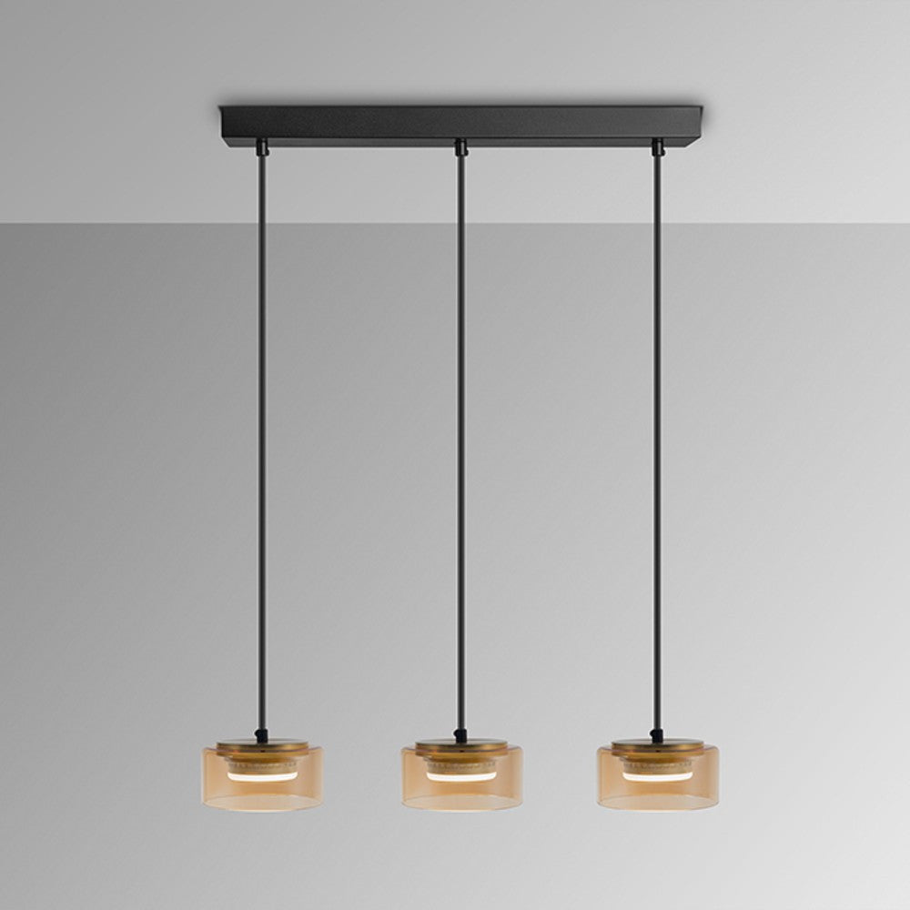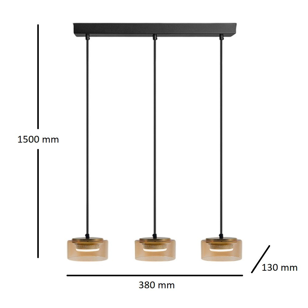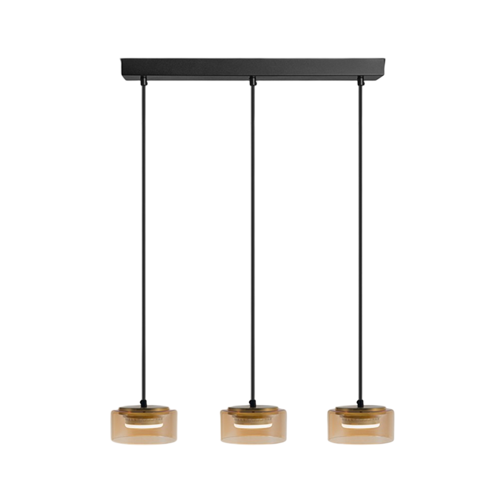 Candeeiro suspenso de 3 lâmpadas feito de metal com acabamento preto fosco e abajur de vidro âmbar. Inclui lâmpadas LED GX53 de 6W 3000K. Ajustável em altura até um máximo de 1500mm.