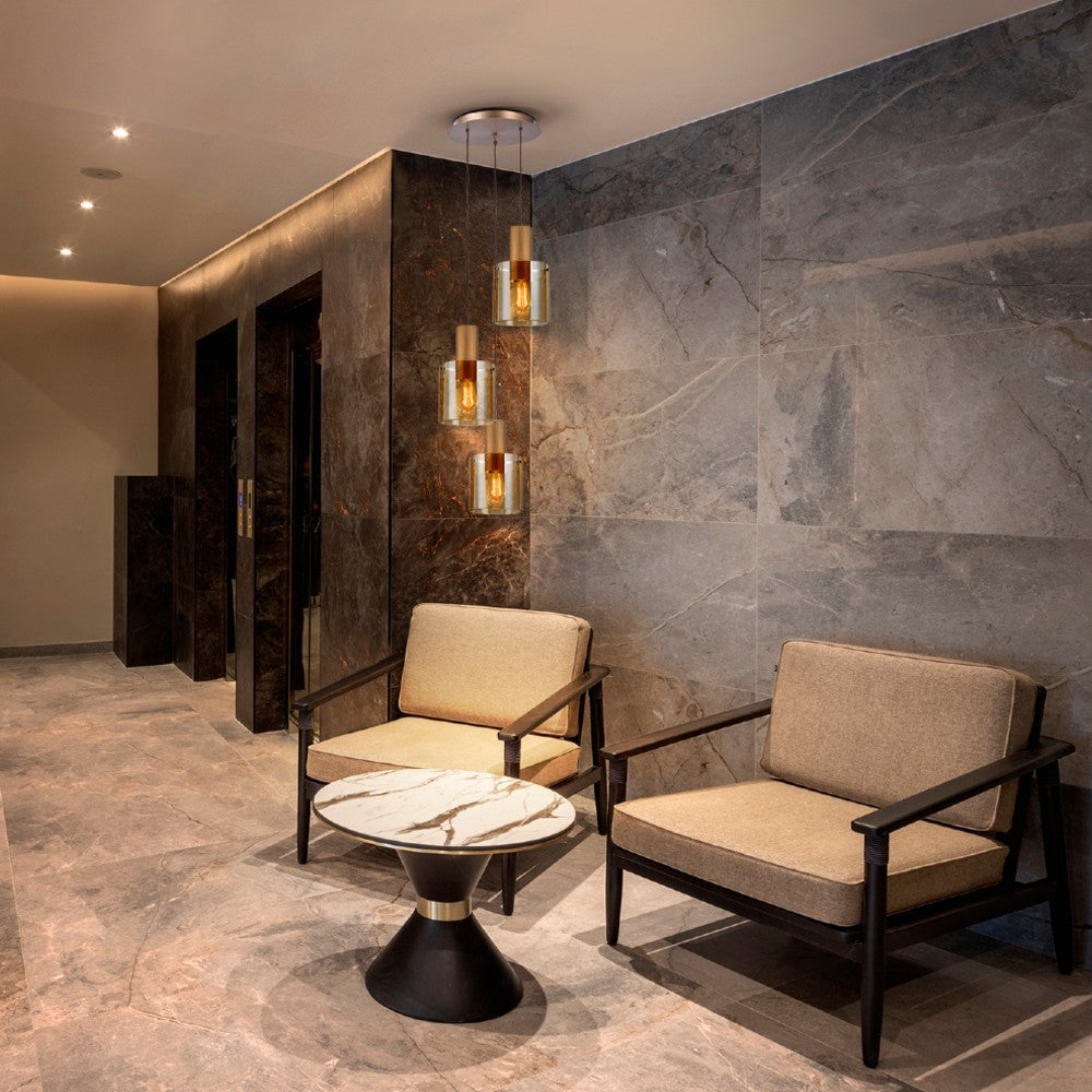 Candeeiro teto Venize 3L elegante realizado em metal com acabamento em cobre acetinado. Apresenta três tulipas de vidro âmbar que proporcionam uma luz quente e acolhedora, criando um ambiente sofisticado e moderno. O cabo têxtil é ajustável em altura, permitindo a adaptação perfeita ao seu espaço. Ideal para salas de jantar, cozinhas, corredores ou qualquer divisão que necessite de um ponto de luz decorativo de charme.