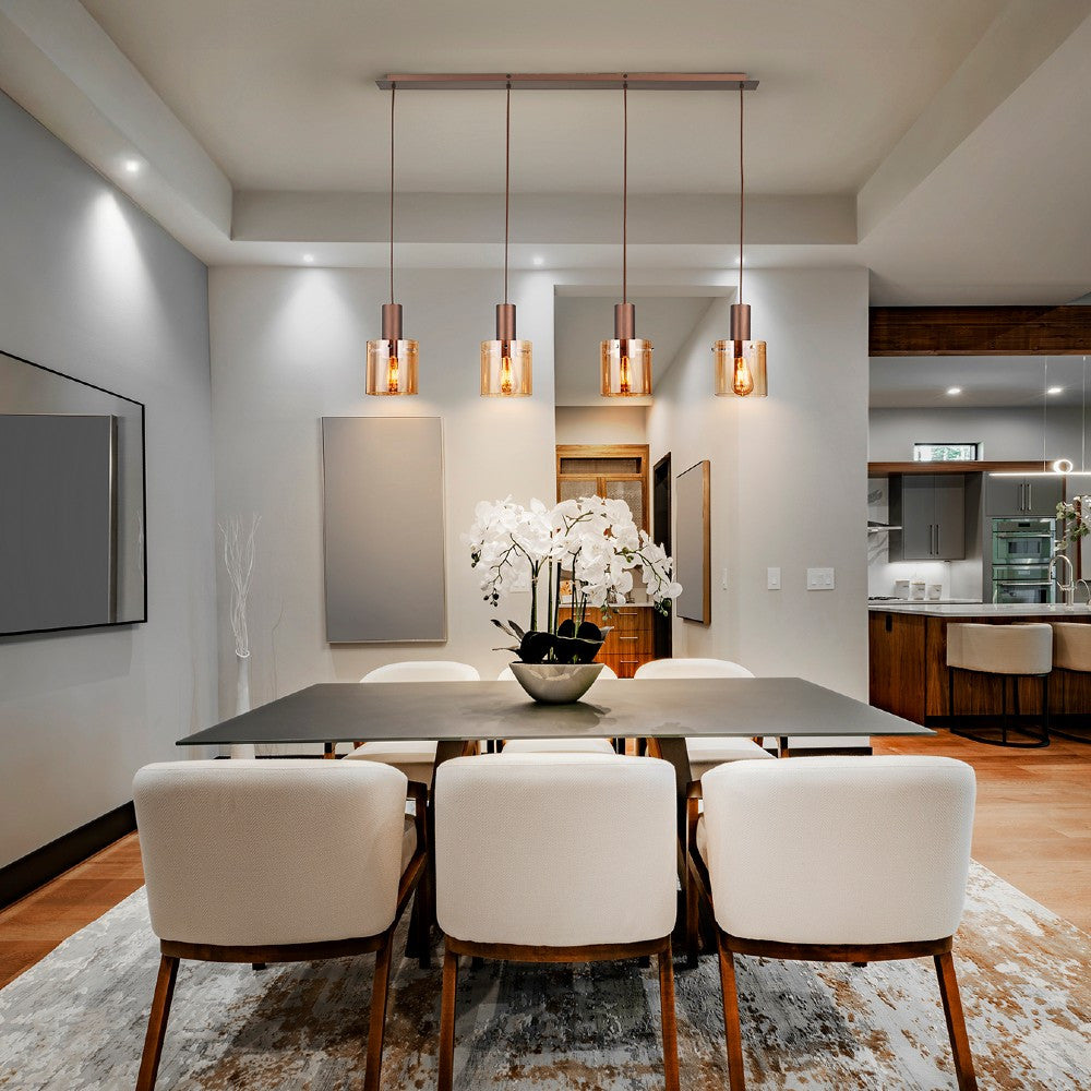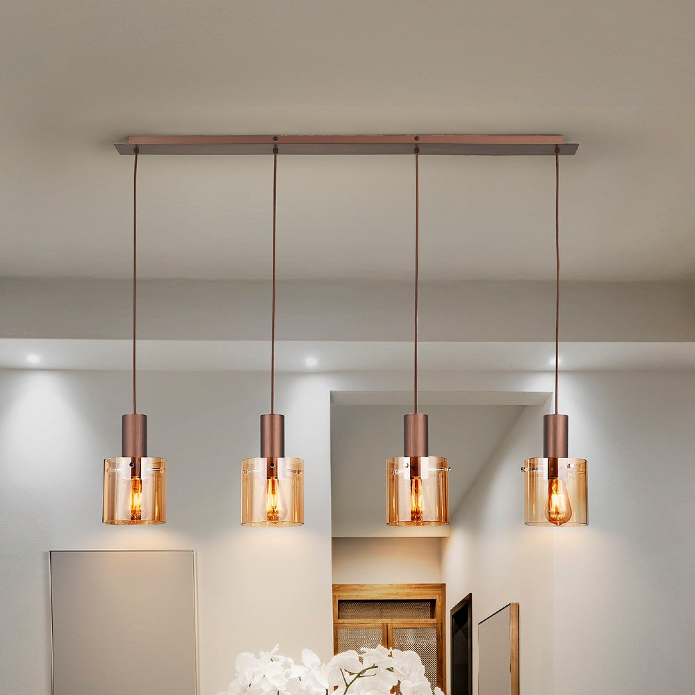 O candeeiro suspenso Venize combina elegância e sofisticação, com acabamento em cobre acetinado e tulipas de vidro âmbar. Ideal para iluminar salas de estar, salas de jantar, cozinhas ou espaços contemporâneos que pedem um toque de requinte. Ajustável em altura, adapta-se a diferentes tetos e ambientes.