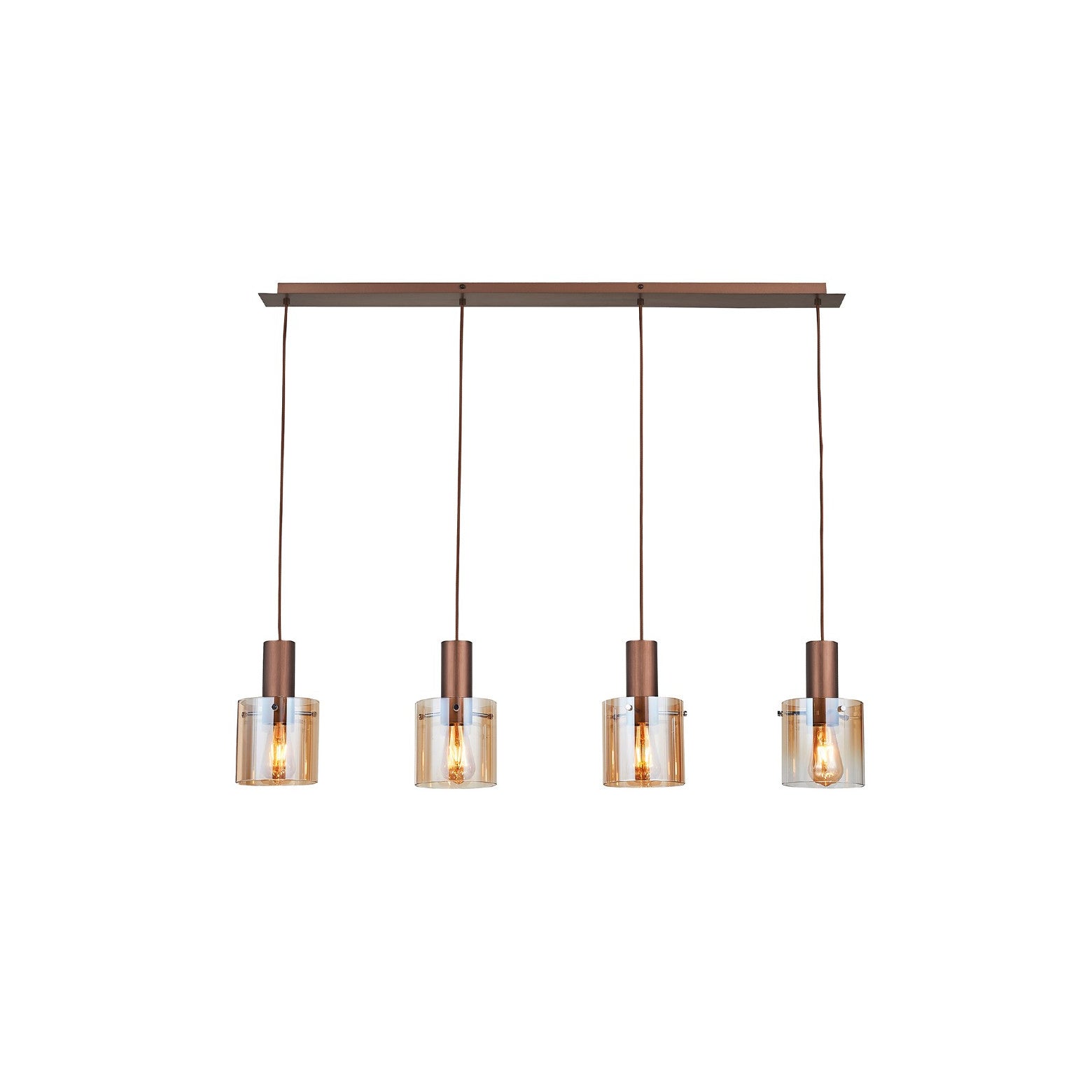 Estrutura em metal com acabamento em cobre acetinado, tulipas em vidro âmbar