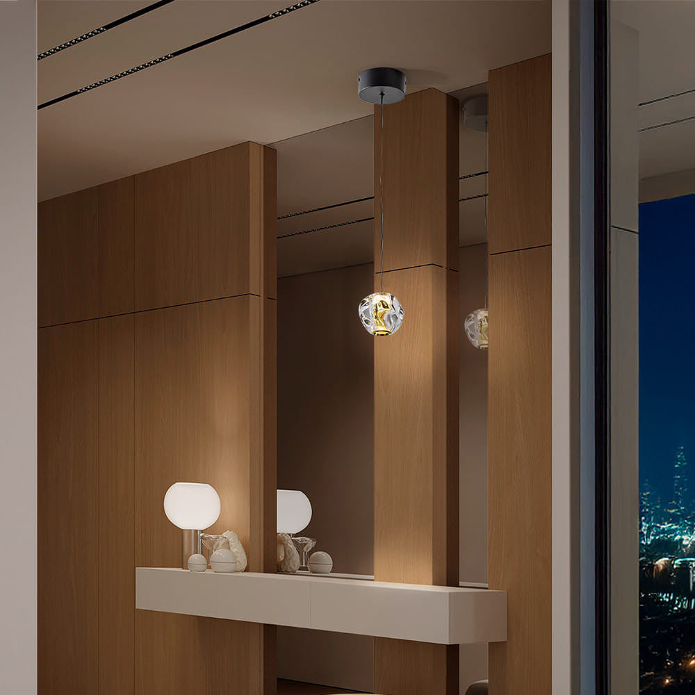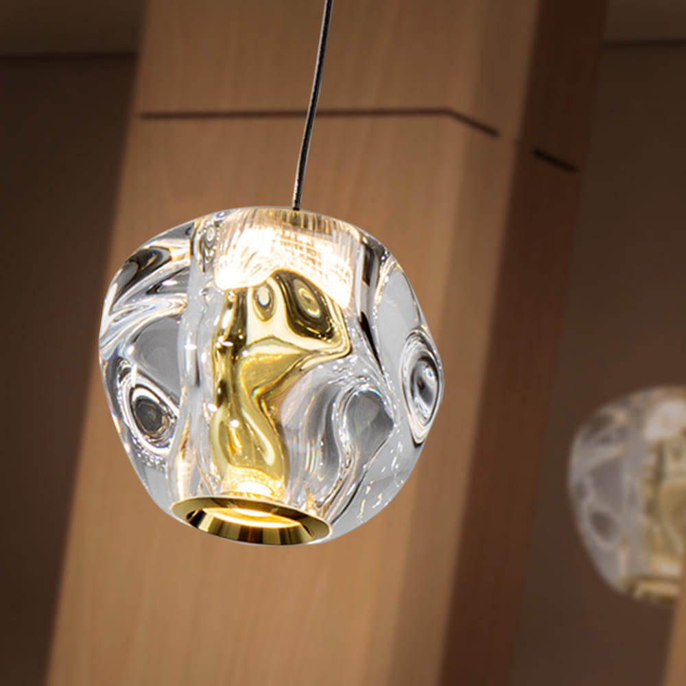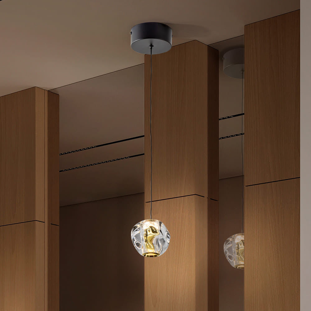 Candeeiro suspenso Zaria dourado e transparente com design moderno e elegante. Estrutura em metal preto mate com detalhes em dourado e tulipa de acrílico transparente. LED integrado de 4,2W, proporcionando luz quente e ambiente acolhedor. Ideal para iluminar salas de estar, quartos, corredores ou espaços contemporâneos.