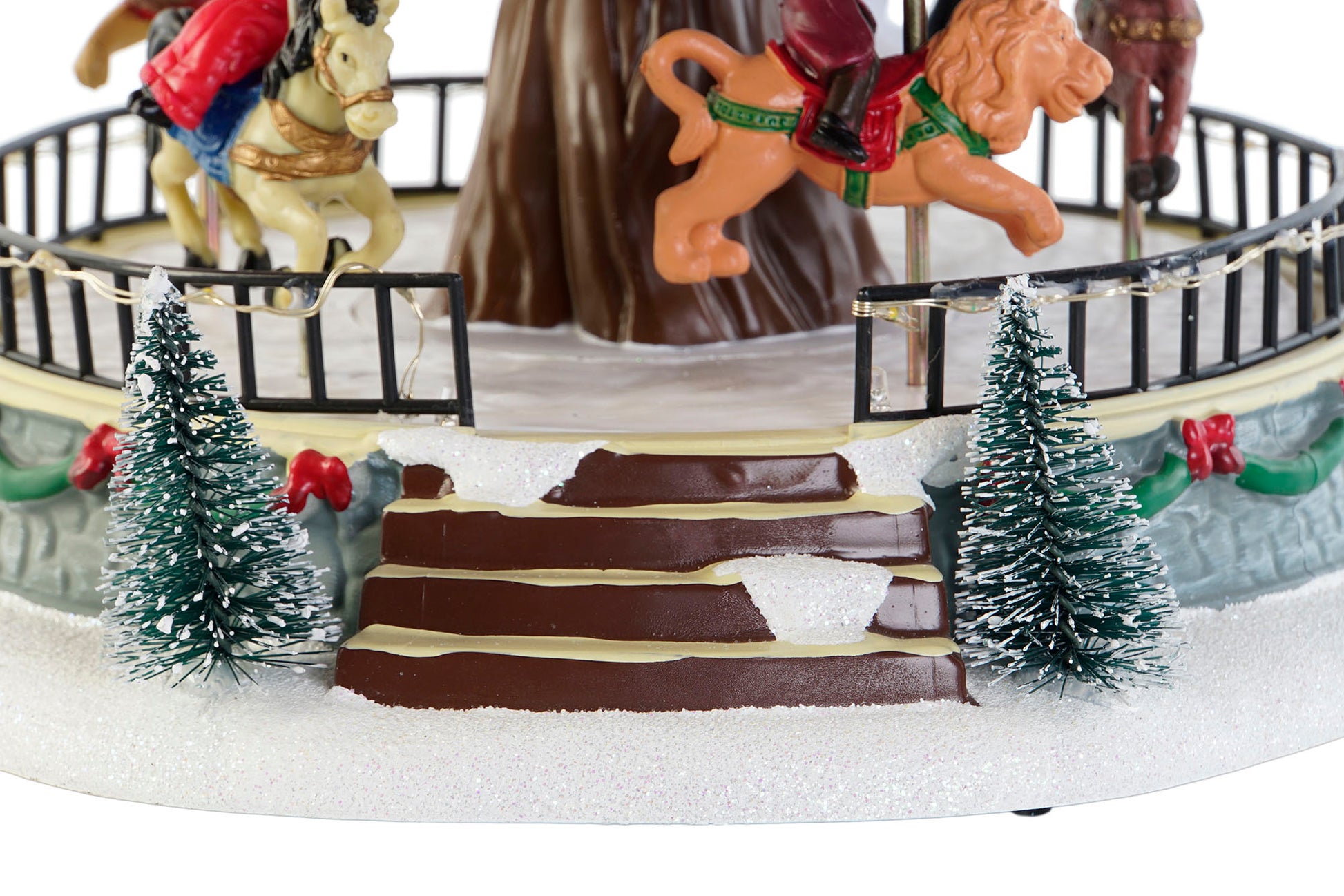 Ao ser ligado, o carrossel ganha vida — gira suavemente ao som de uma melodia natalícia encantadora, enquanto as luzes LED realçam o movimento e o brilho das figuras. Uma peça que combina tradição, emoção e elegância, ideal para destacar em qualquer decoração de Natal, seja numa consola, aparador ou como centro de mesa.