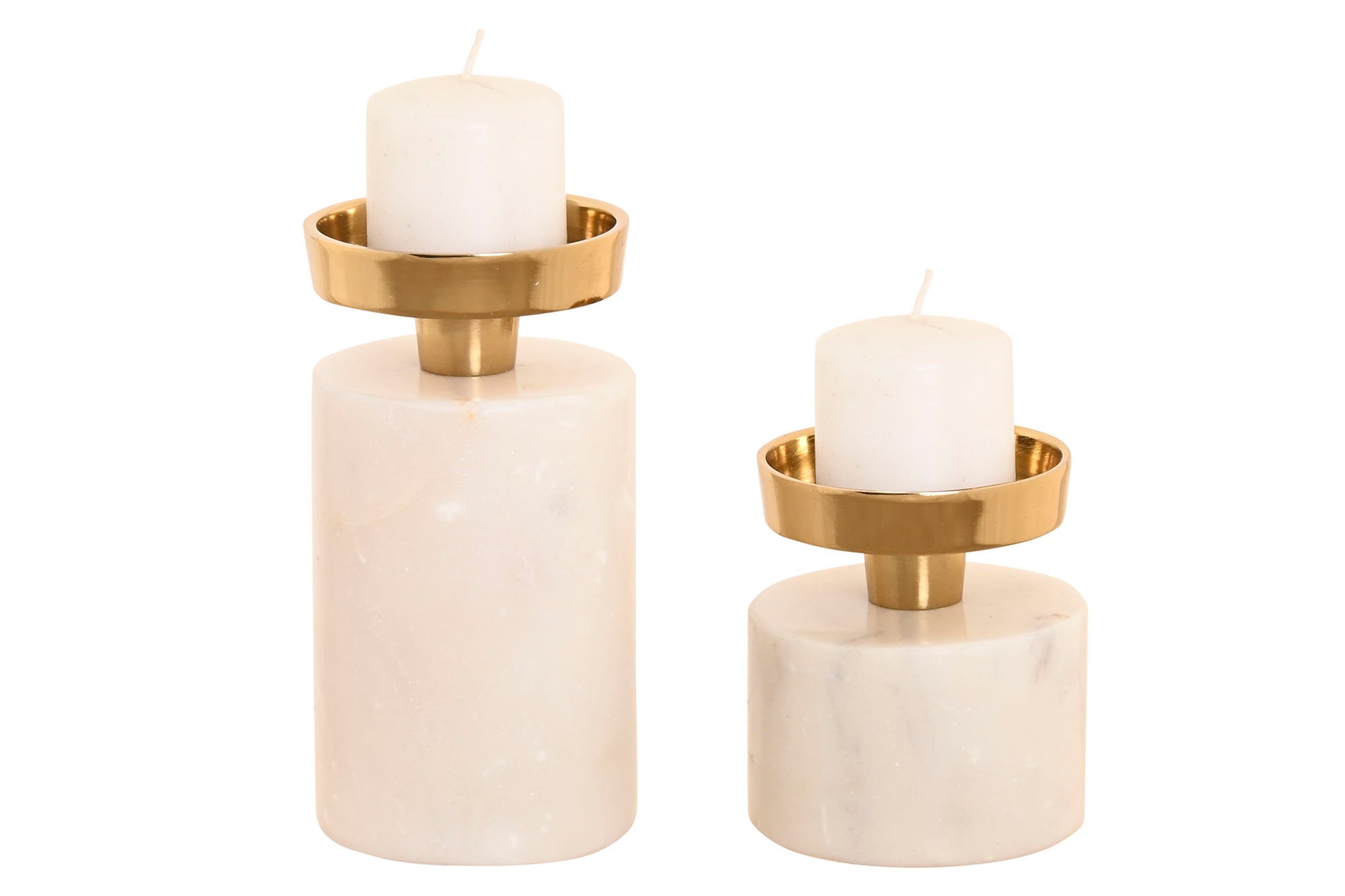 Conjunto de 2 castiçais em granito branco com detalhe em aço dourado, ideais para acrescentar sofisticação e brilho a qualquer ambiente. O contraste entre a solidez do granito e o acabamento metálico cria uma peça decorativa marcante, perfeita para espaços de estilo glam. Podem ser usados em conjunto ou separadamente, sobre mesas, aparadores ou consolas, criando uma atmosfera acolhedora e requintada.