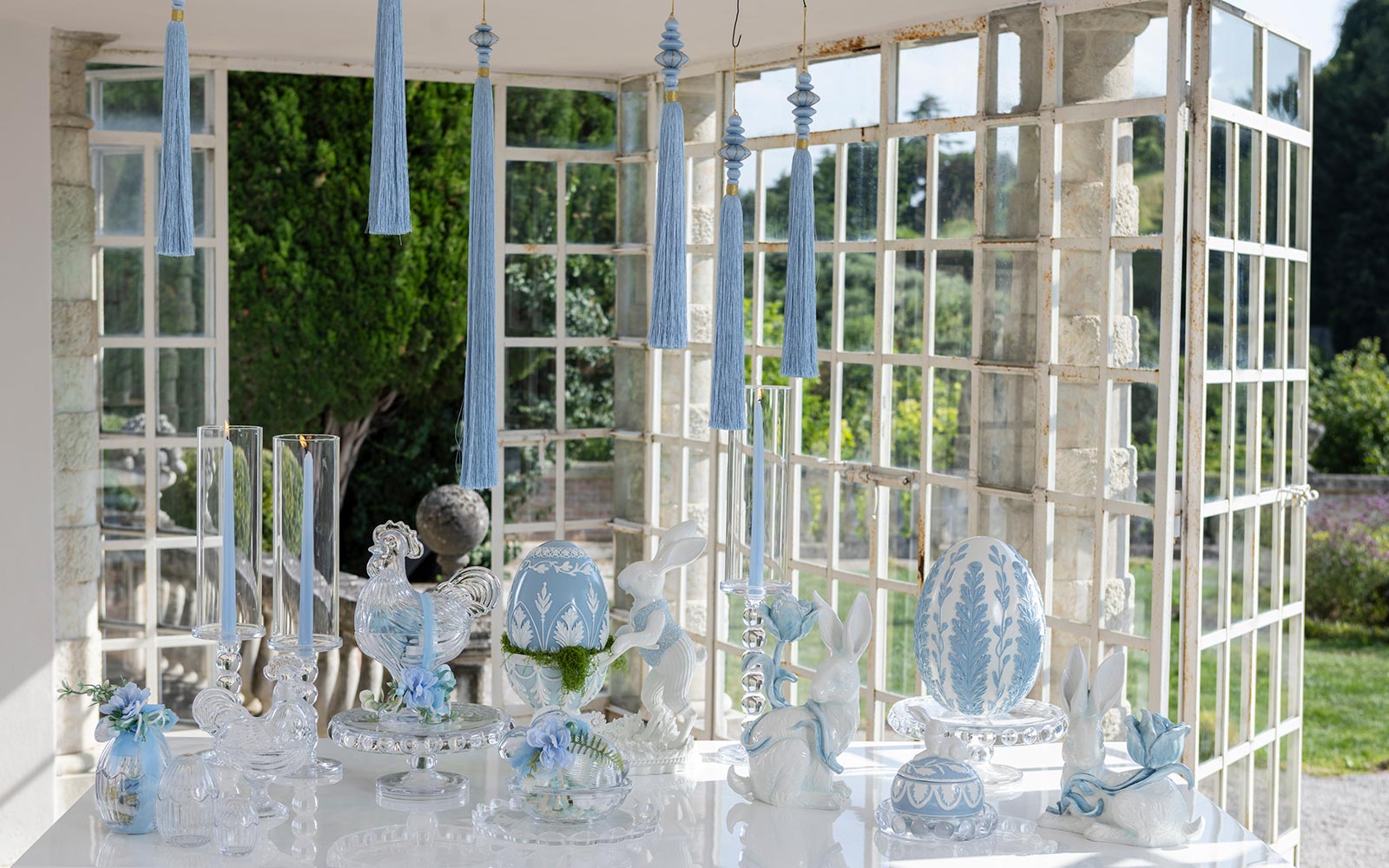 Esta adorável peça decorativa apresenta um coelho elegante acompanhado de um carrinho contentor em tons azuis, criando uma composição única que combina charme e requinte.