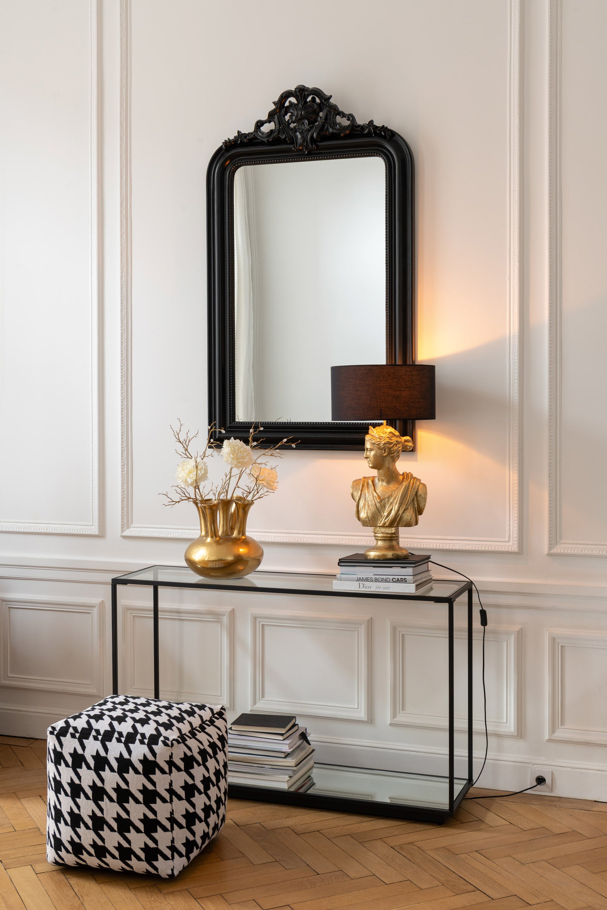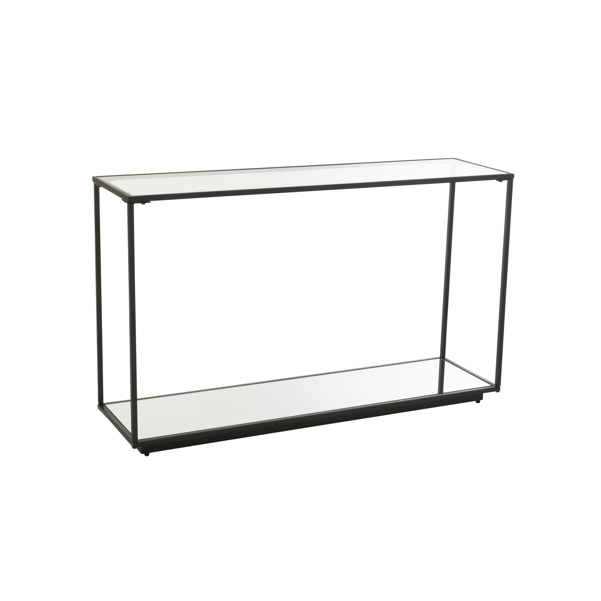 Consola Cube, estilo contemporâneo, a consola tem uma estrutura metálica preta com acabamento mate que contrapõem o vidro transparente e o espelho na base. Uma peça de aspecto leve para a sua entrada, hall, ou toucador para o seu quarto.