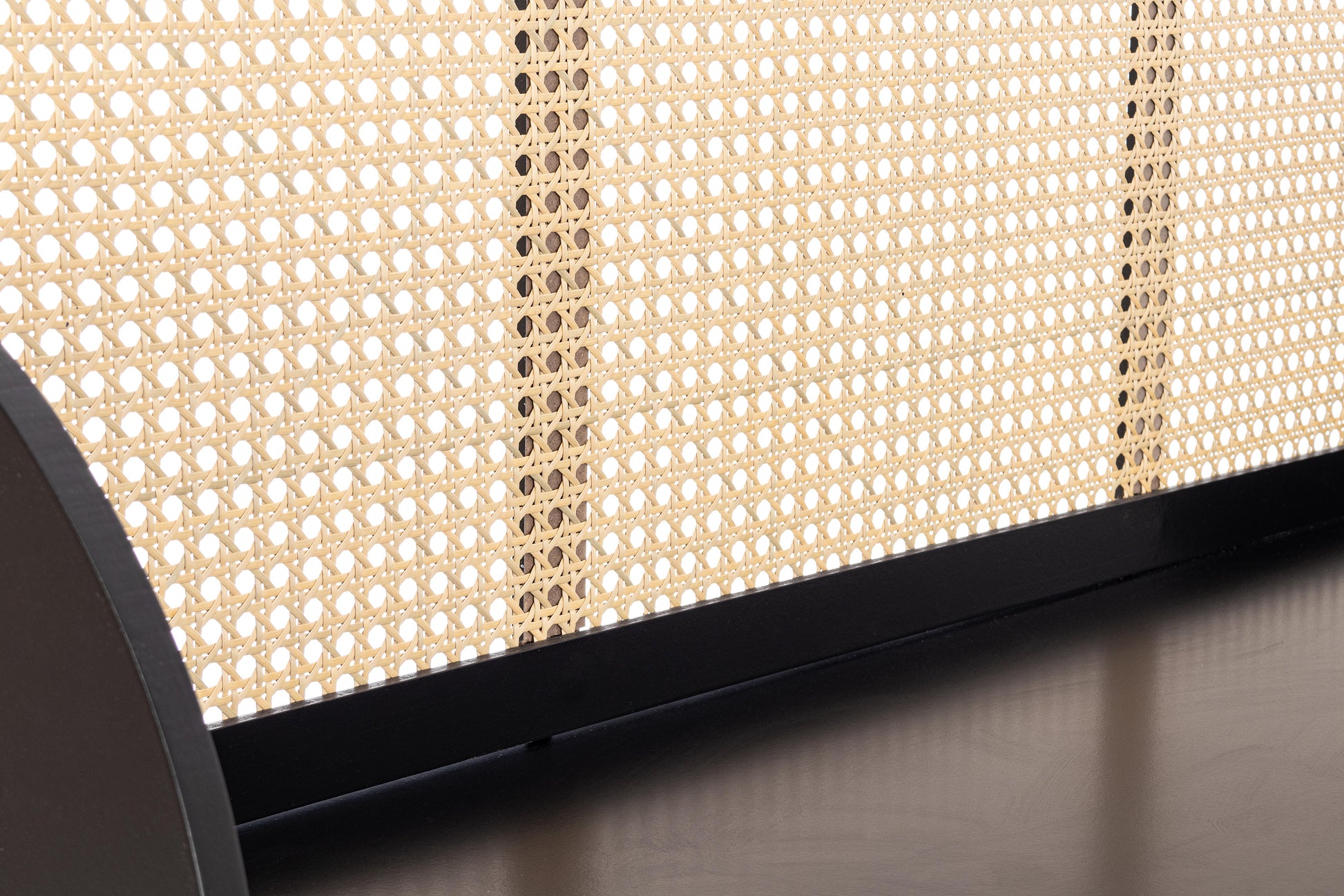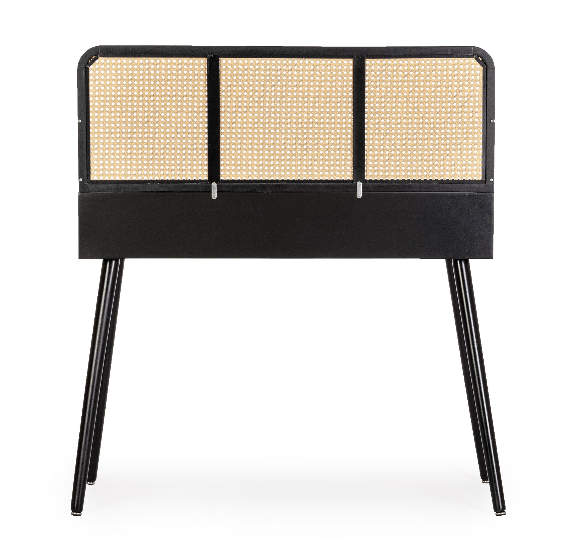 Consola Josine Preto, Secretária ou Consola em estilo clássico, com compartimentos fechados de gavetas para uma arrumação fácil. Pernas com estrutura de madeira preta e tampo de madeira, com aplicação de vime.