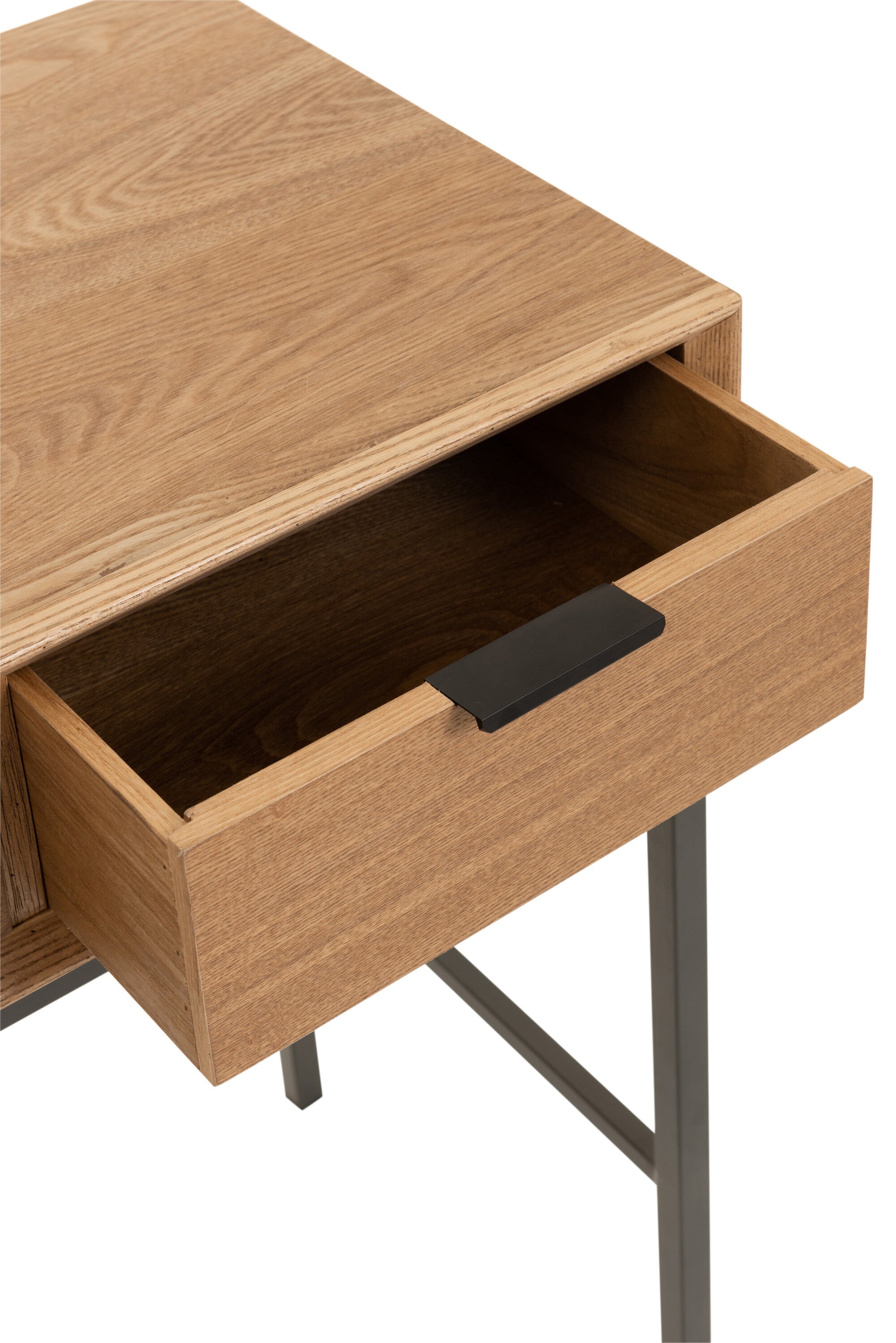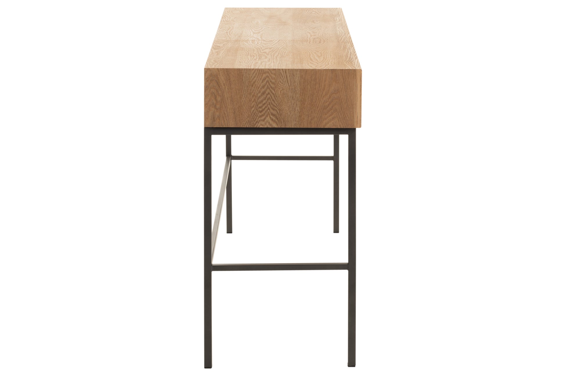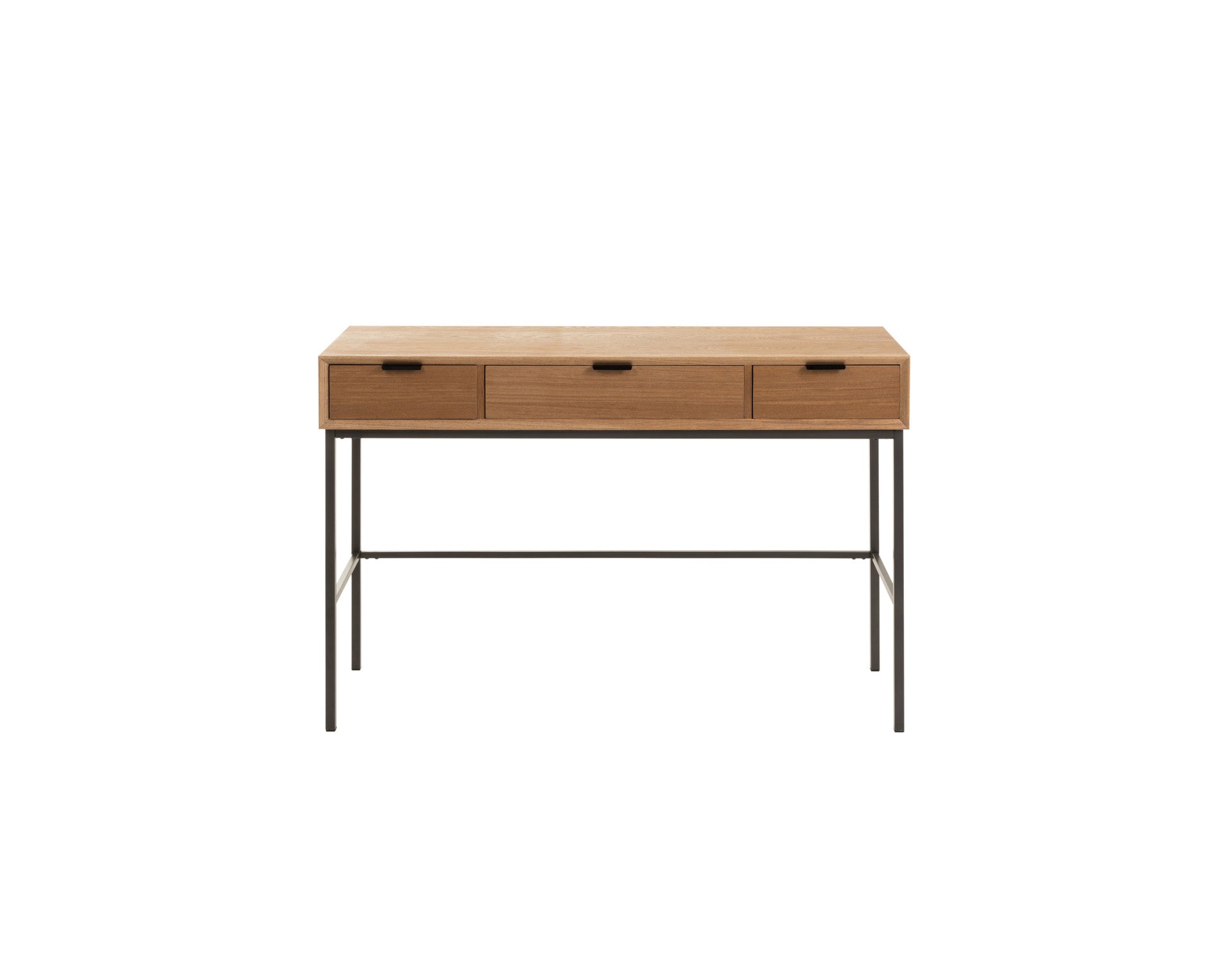 Consola em estilo contemporâneo, com três gavetas e tampo de madeira e pernas de metal, com um aspecto leve e contemporâneo para a sua entrada.