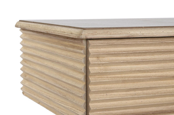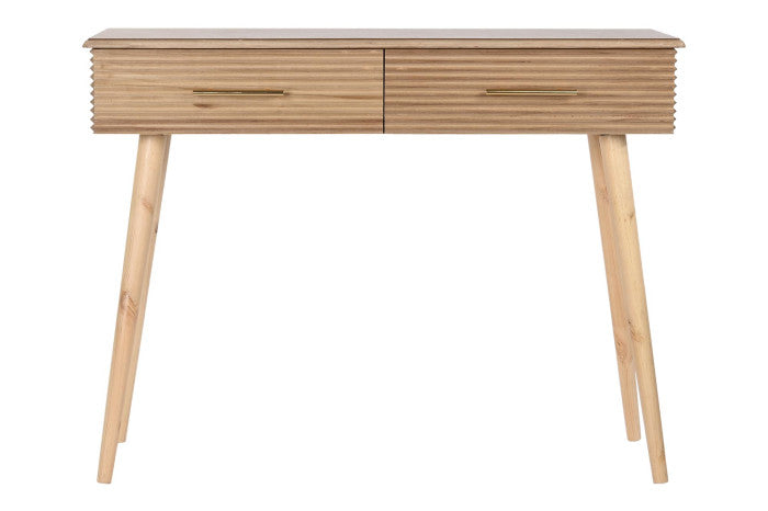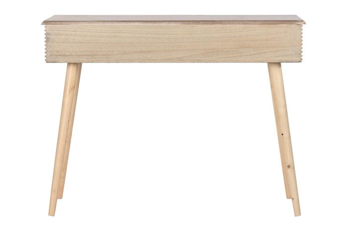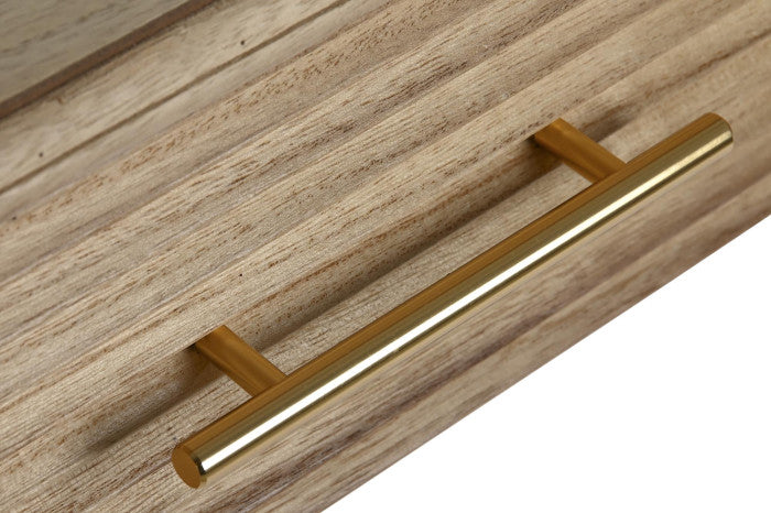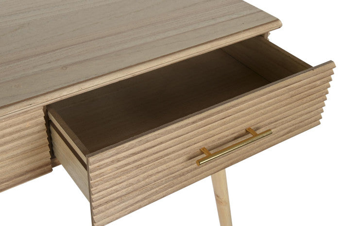 Consola Madeira Paulownia 100cm. Consola ou secretária em estilo boho ou vintage, com compartimento fechado de gavetas para uma arrumação fácil, puxadores dourados para design descontraído. Pernas de madeira com estrutura de tampo de madeira.