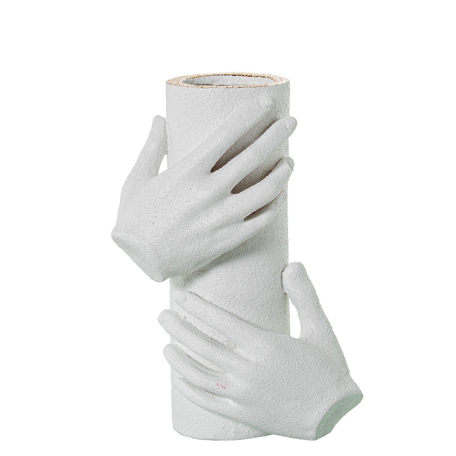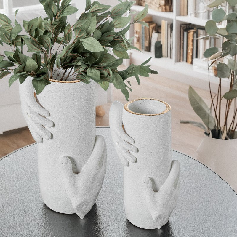 Esta jarra branca texturada tipo areia é uma peça que combina arte, elegância e significado. O seu design único apresenta duas mãos esculpidas que se elevam com delicadeza, adornadas por uma pintura dourada que acrescenta um toque de sofisticação e modernidade.