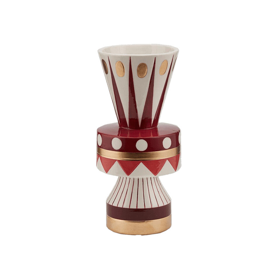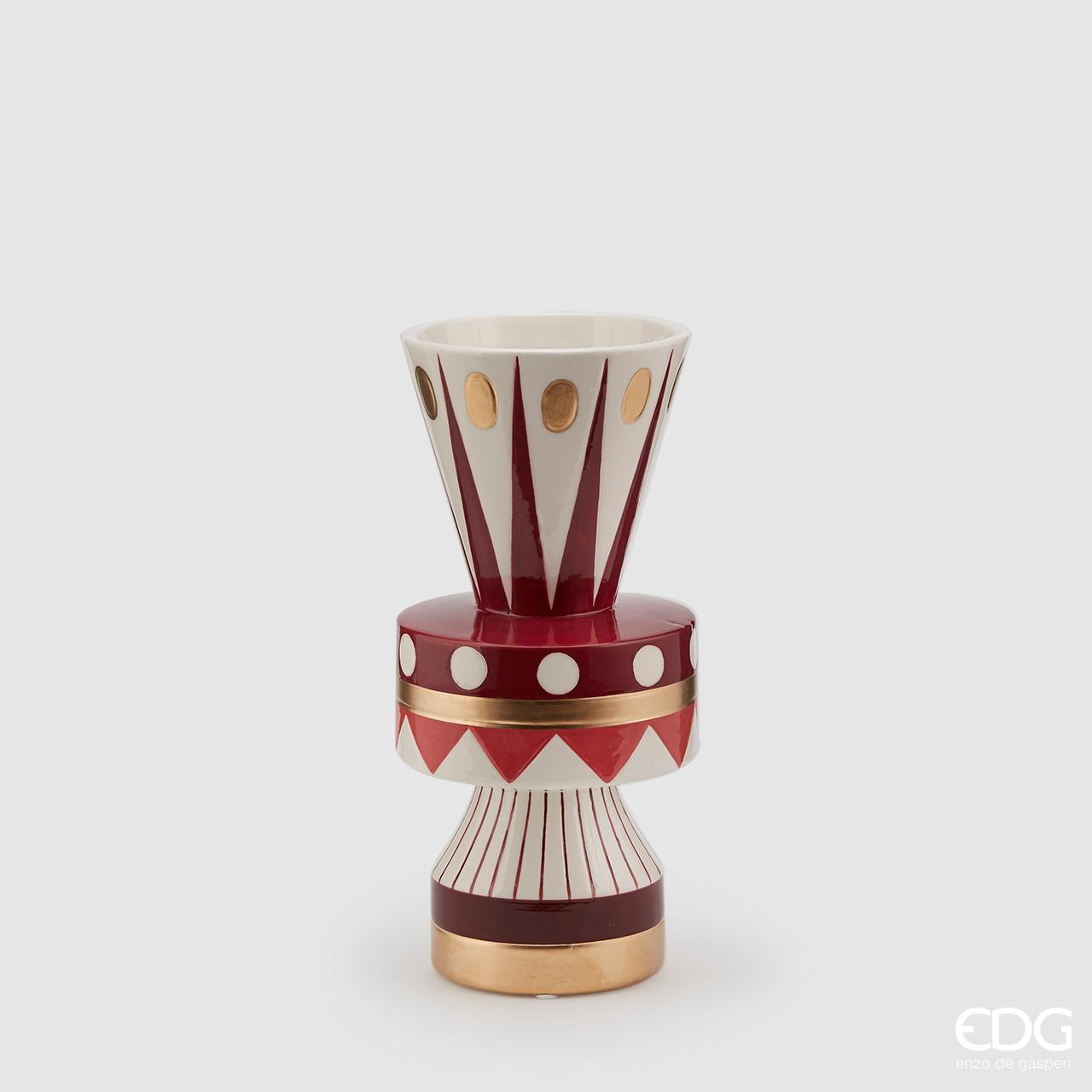 Jarra cerâmica com padrão geométrica vermelho e dourado.