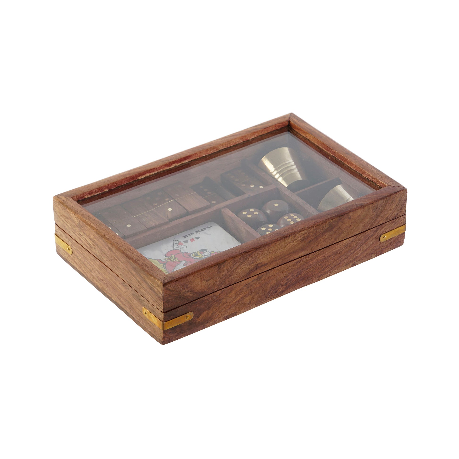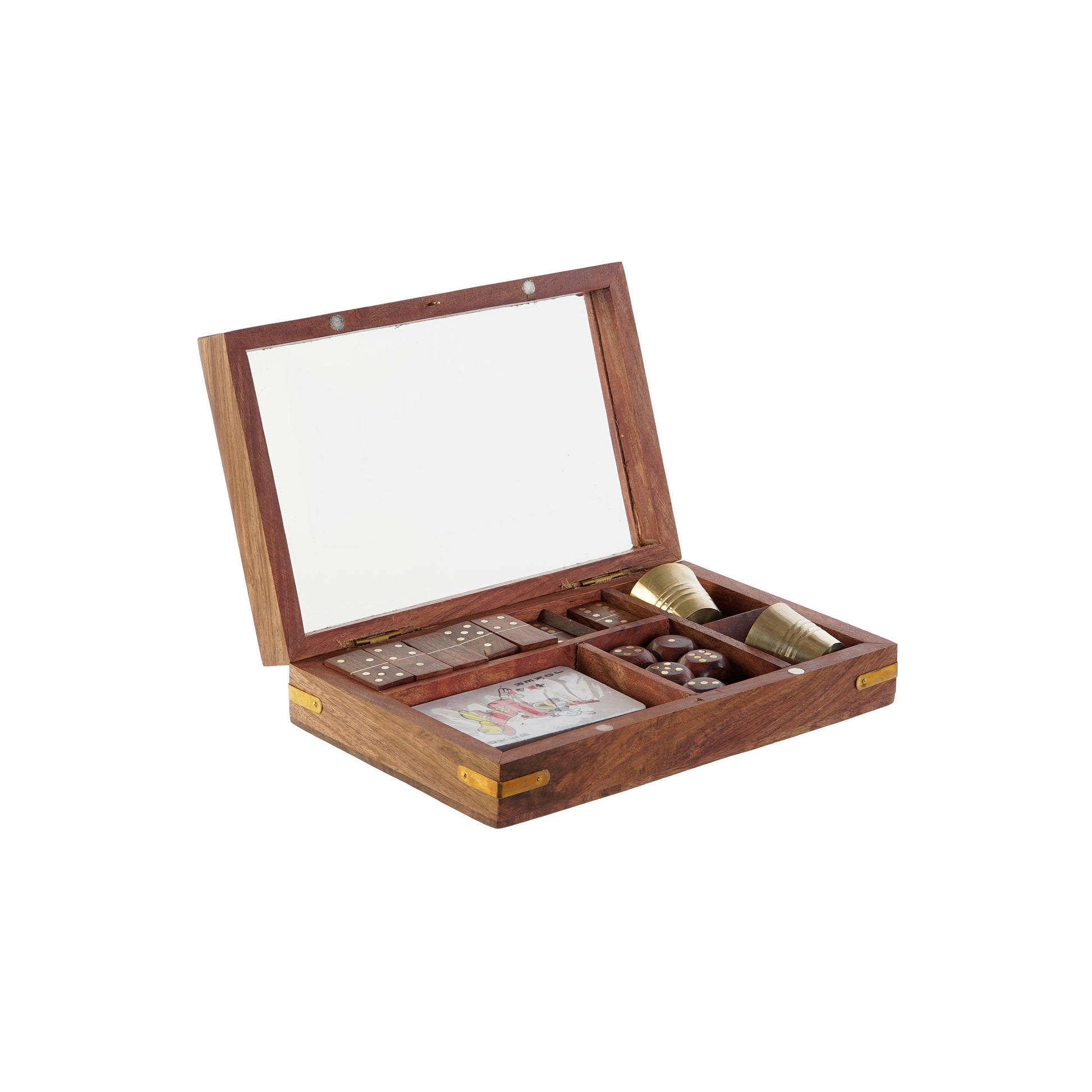 Este jogo de dominó, dados e cartas é mais do que entretenimento. A própria caixa que guarda as peças em madeira, com detalhes dourados. Minimalista, ousado e inesperado, é o tipo de objeto que surpreende, seja numa prateleira, numa mesa de centro ou nas mãos de quem joga.