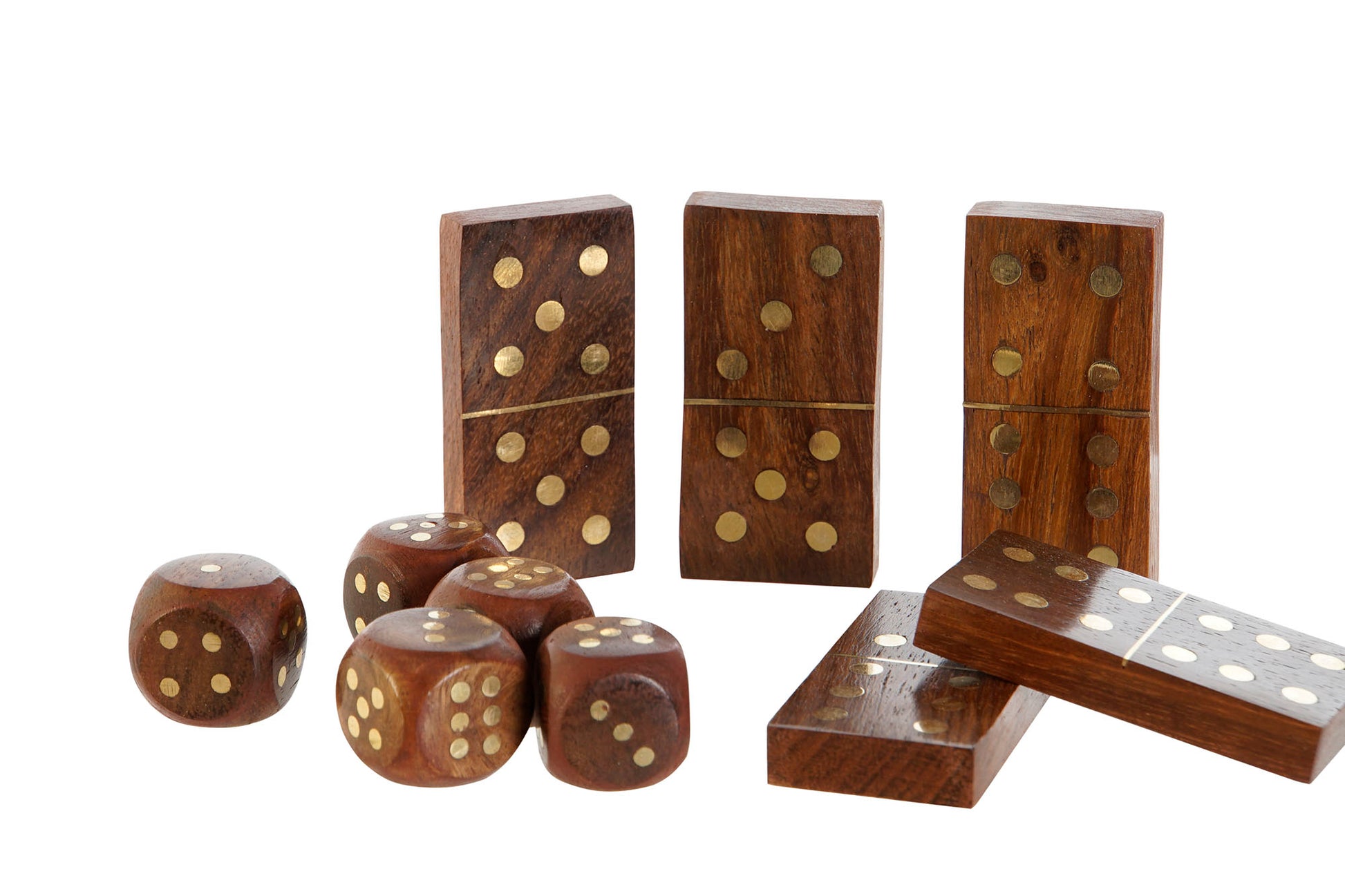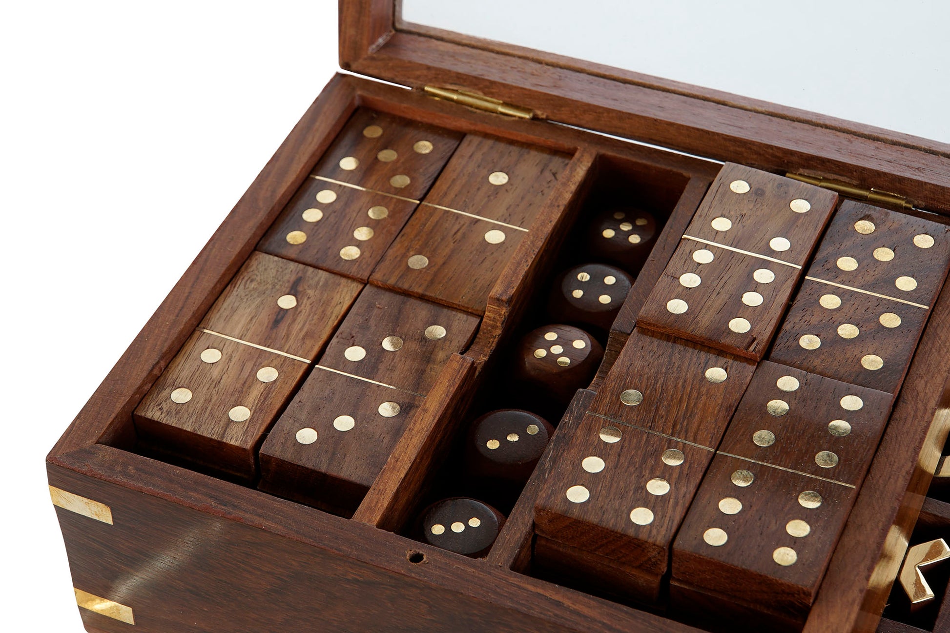 Este jogo de dominó e dados é mais do que entretenimento. A própria caixa que guarda as peças em madeira, com detalhes dourados. Tradicional, ousado e inesperado, é o tipo de objeto que surpreende — seja numa prateleira, numa mesa de centro ou nas mãos de quem joga.