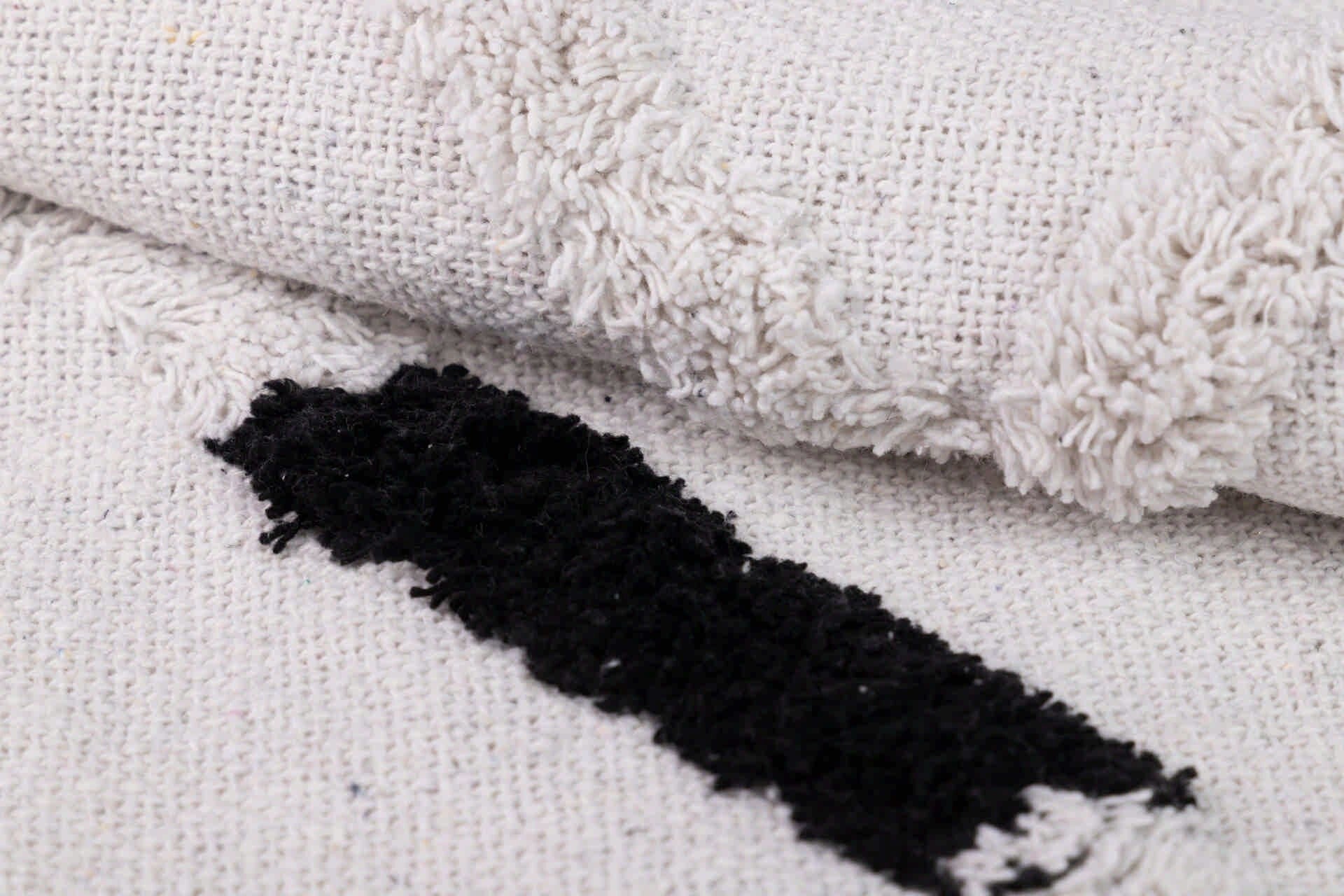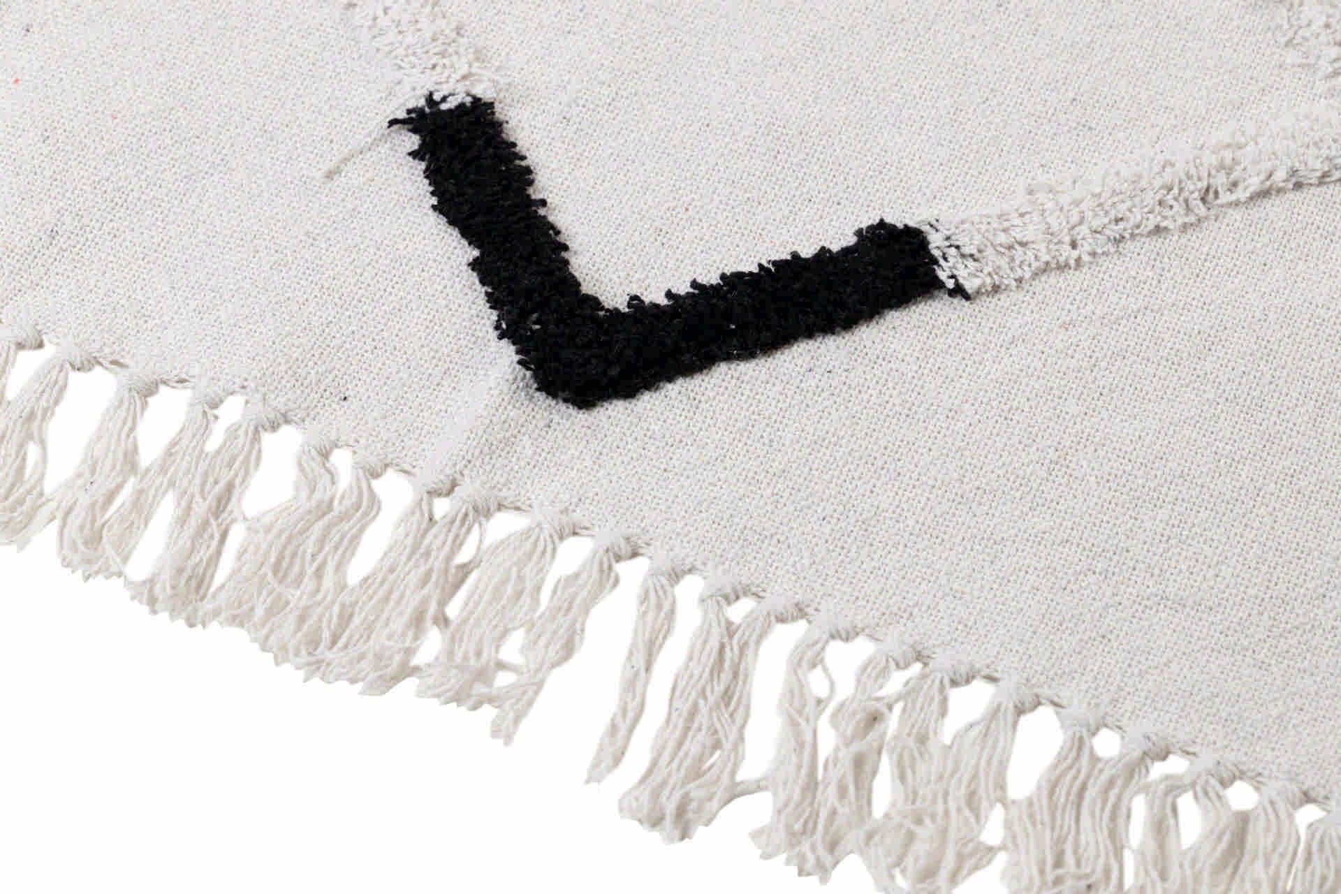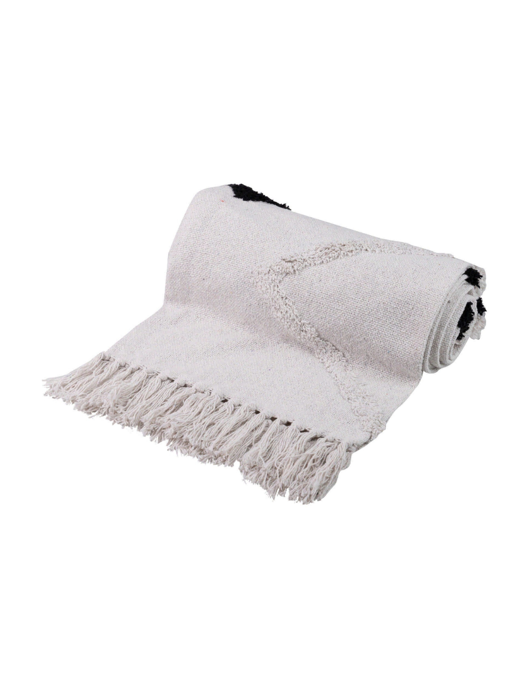 Manta Ibiza Branco e Preto 125x150 cm. Num tom branco cru, com franjas brancas e padrão texturado também em branco com apontamentos pretos. As mantas são elementos decorativos que acrescentam um toque extra de elegância a uma peça de mobiliário e reforçam o aspecto de qualquer divisão.Coloque-a na cama, combinando-a com outras diferentes texturas, no apoio de braço de um sofá, no apoio de pés da sua cadeira de leitura ou dobrado sobre qualquer poltrona ou cadeira. Estas peças são os adereços perfeitos, um objeto que adorará ter sempre à mão.