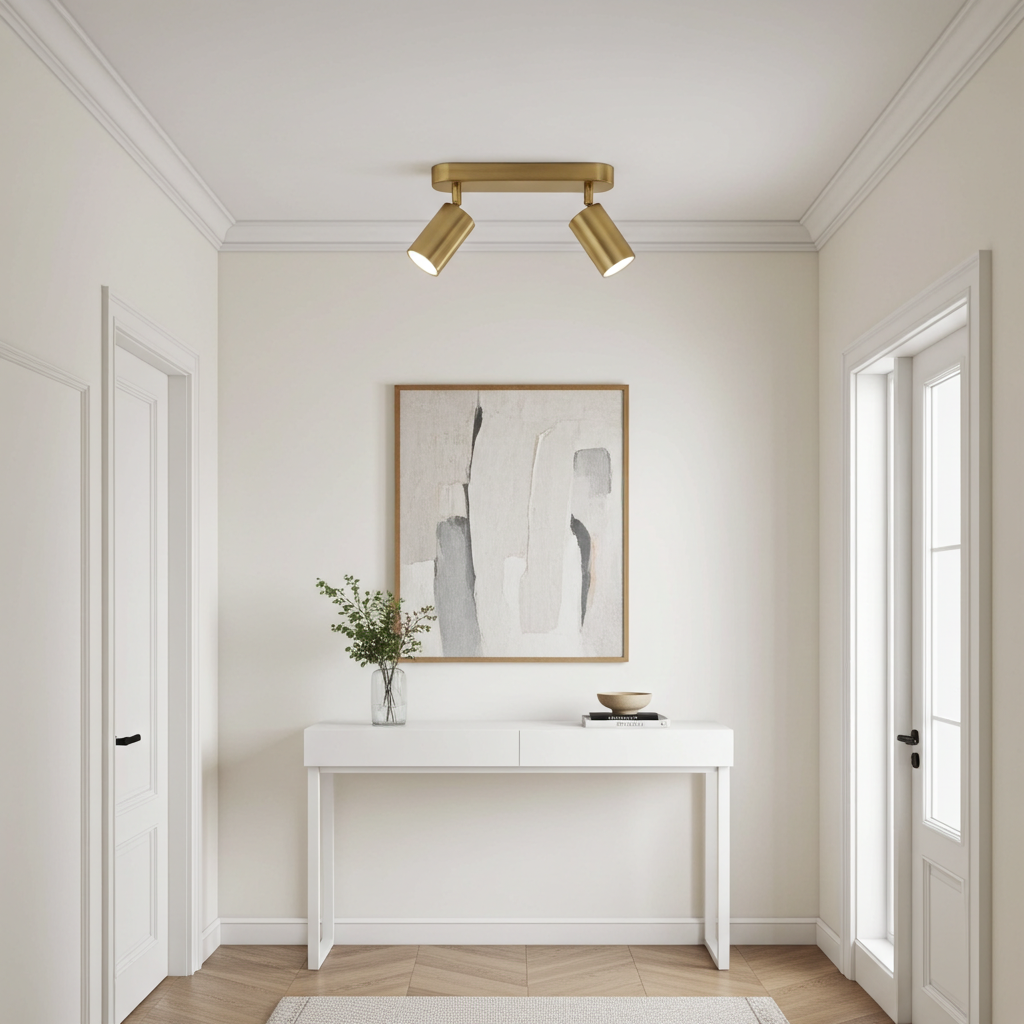 O Projetor Andy c/2 focos dourado é a escolha perfeita para quem procura um candeeiro de teto moderno e elegante. Com base metálica dourada e spots/projetores ajustáveis, permite direcionar a luz conforme a necessidade, destacando áreas específicas do ambiente e criando um efeito de iluminação sofisticado. Ideal para salas de estar, salas de jantar, quartos, corredores, hotéis ou restaurantes.