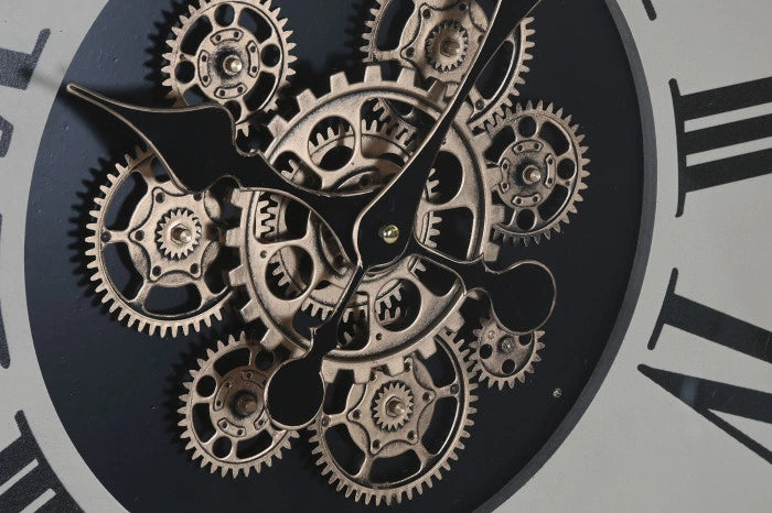 Com 91 cm de altura por 74 cm de largura, este relógio não passa despercebido — é uma verdadeira afirmação de estilo. O seu mecanismo interior visível, com rodas dentadas em movimento, não só marca as horas com precisão, como hipnotiza ao revelar a beleza do funcionamento mecânico, num espetáculo visual constante.