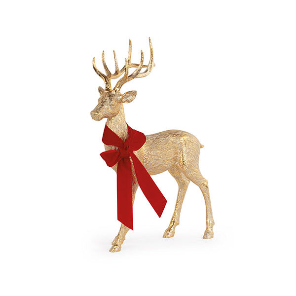 Esta encantadora rena dourada é uma peça que irradia elegância e espírito natalício. Com acabamento metálico brilhante e detalhes em laços de veludo nas cores bordeaux e verde, é o toque perfeito para completar a decoração de Natal com requinte e sofisticação.