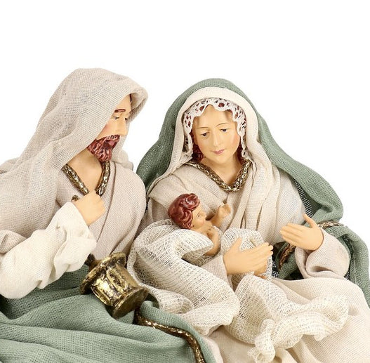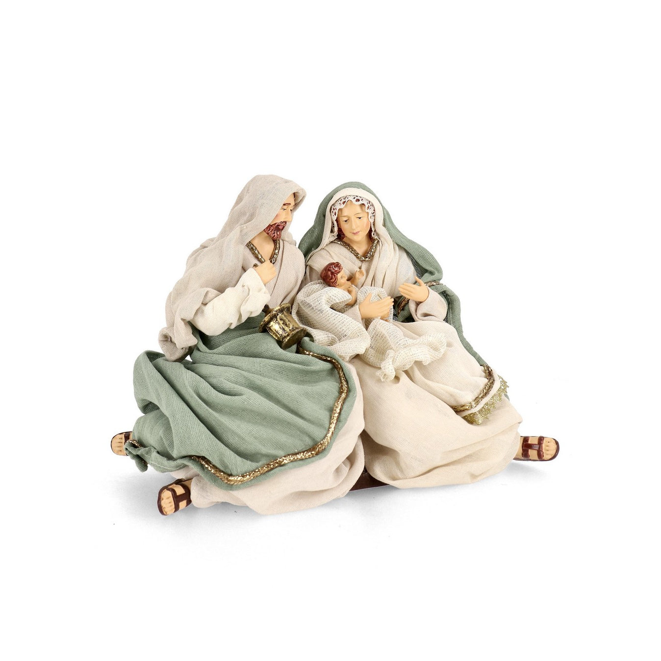 Celebre o verdadeiro espírito do Natal com esta encantadora Sagrada Família sentada tom verde e dourado, uma peça que transmite serenidade, fé e harmonia. Cuidadosamente trabalhada com tecidos e detalhes delicados, esta escultura é perfeita para criar um ambiente acolhedor e cheio de significado na sua decoração natalícia.