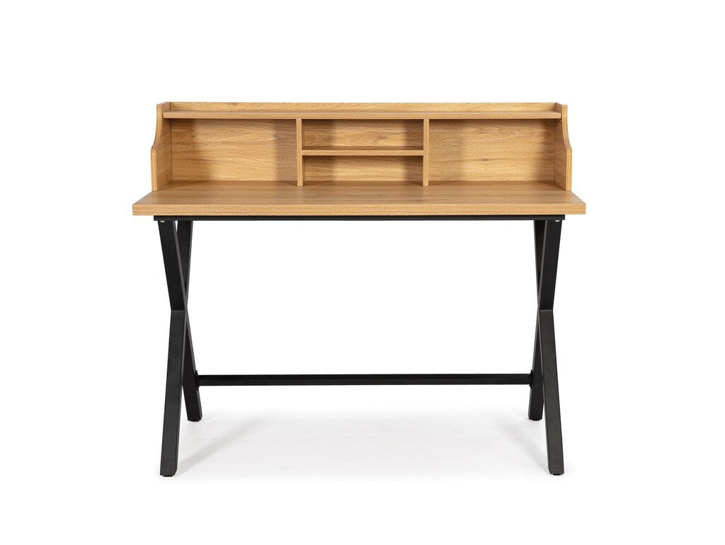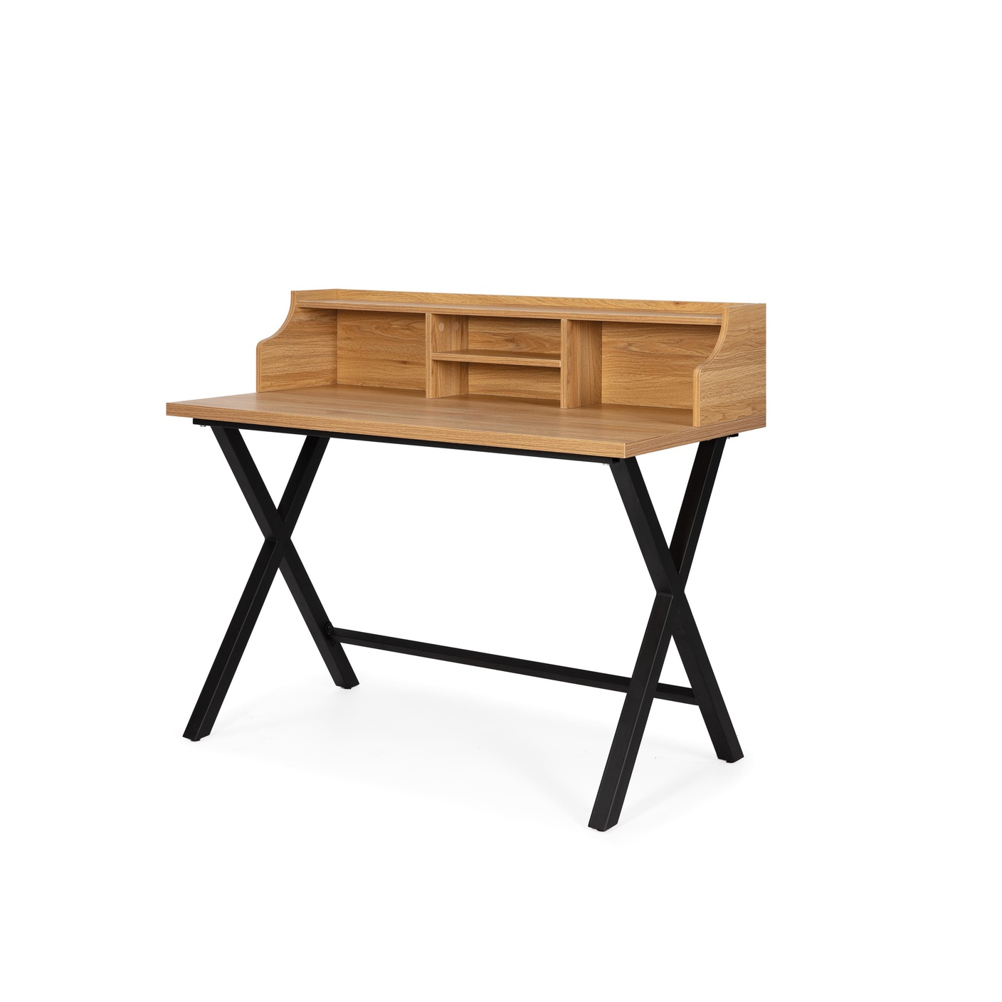 Secretária X madeira e preto 120 cm. Secretária ou Consola em estilo clássico, com compartimentos abertos para uma arrumação fácil. Pernas com estrutura de metal preto e tampo de madeira.